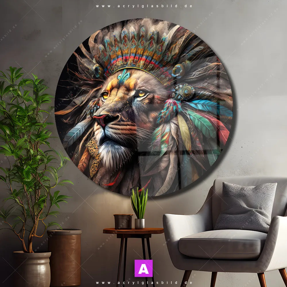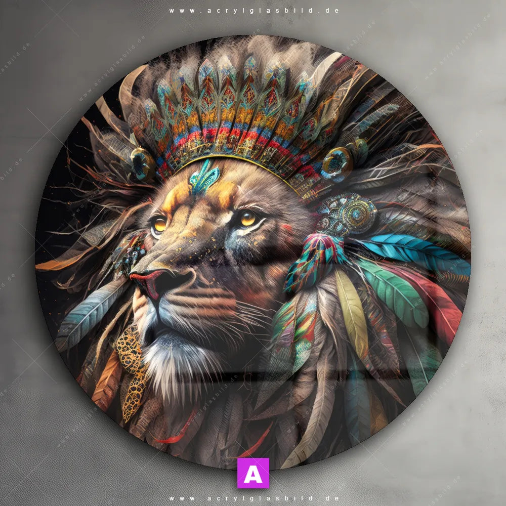 Acrylglasbild | Löwenkopf mit bunten Federn | Rund