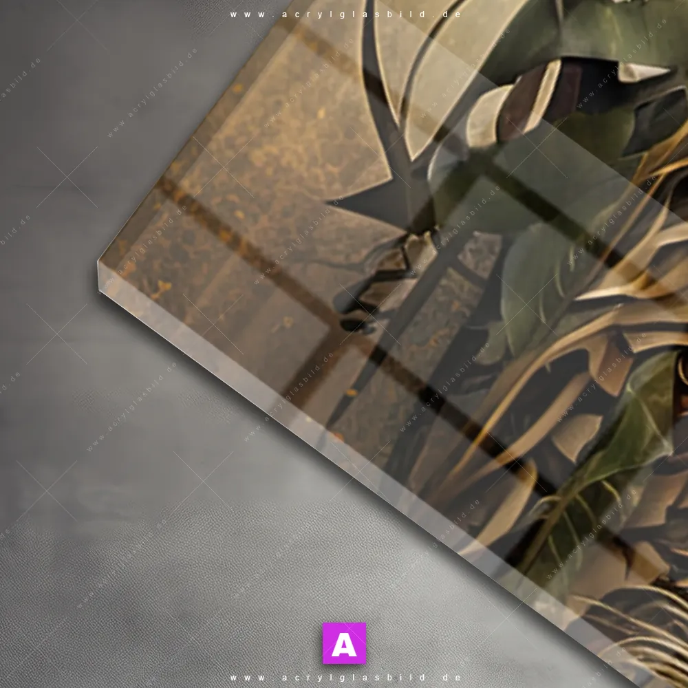 Das Motiv Löwenkopf mit Krone wird im UV-Direktdruck in den Farben Schwarz, Gold, Beige auf die Rückseite einer 5mm starken, transparenten Acrylglasplatte gedruckt. Das durchscheinende Motiv Goldener Löwe mit Blätterkrone im Surreal - Fantasy, Modern Art Stil wird anschließend vollflächig mit einer weißen Schicht hinterlegt. Das Tierwelt Acrylglasbild | Panorama erhält so eine bemerkenswerte Farbbrillanz, hohe Schärfe und erstaunliche Tiefenwirkung.