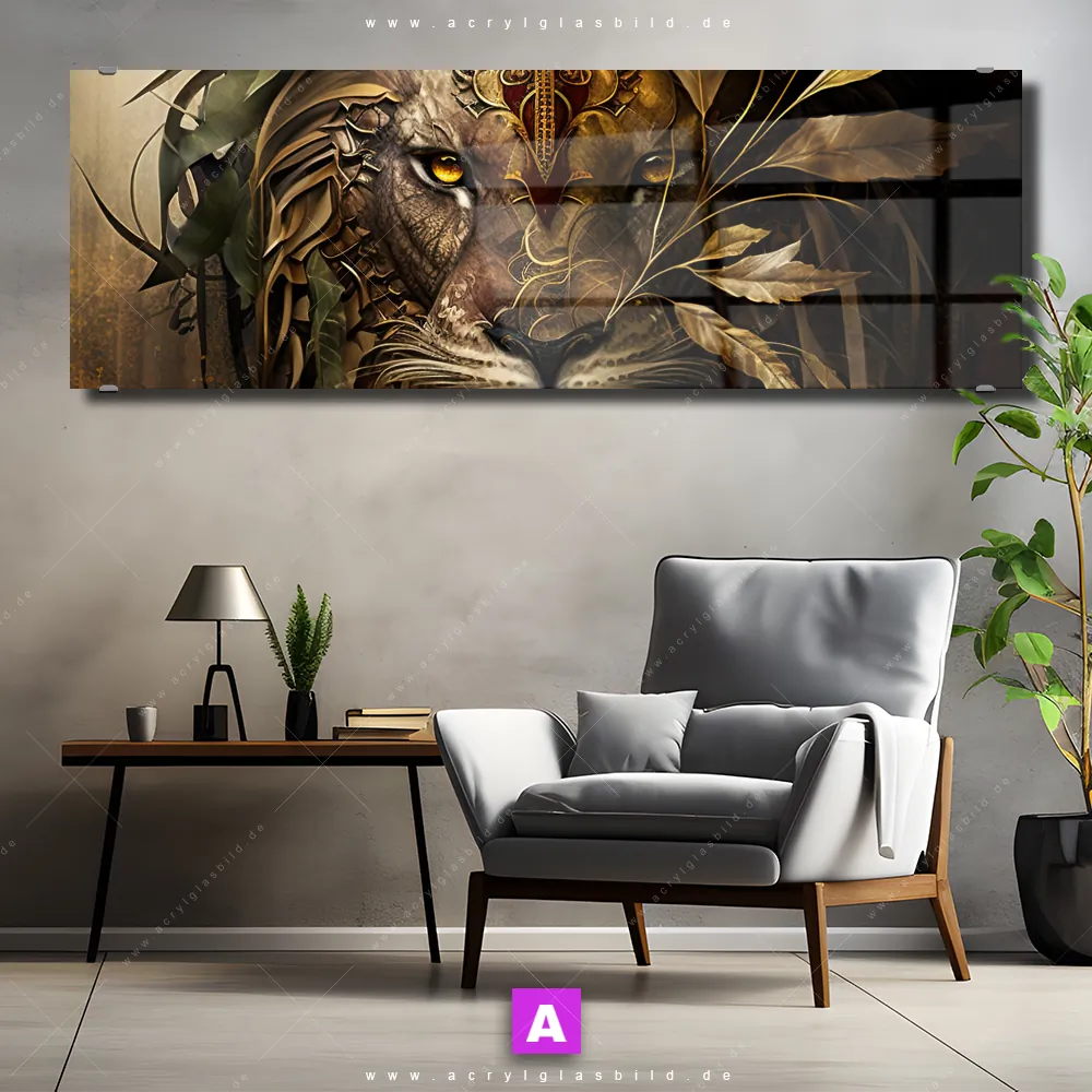 Fehlt dir die Inspiration beim Anblick deiner Wände, sodass selbst das Zählen der Wandfarbtropfen aufregender erscheint? Keine Sorge, wir haben das perfekte Kunstwerk für dich! Mit unserem Acrylglasbild Löwenkopf mit Krone im Panorama-Format verleihst du deinem Raum den dringend benötigten Wow-Faktor. Lass deine Wände mit unserem Löwe mit Laubkrone Acrylglasbild zum Star werden!