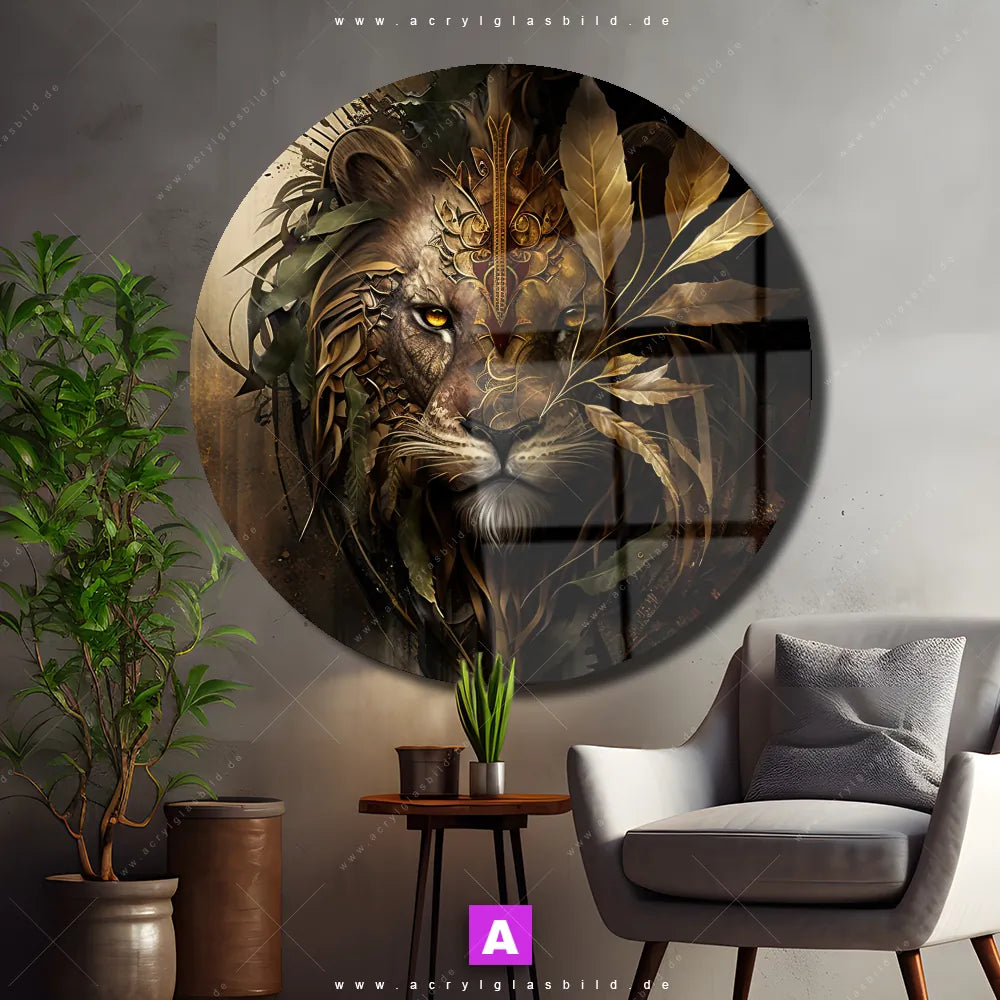 <b>Produktart:</b> Acrylglasbild | Glasbild | Wandbild aus Kunstglas | <b> Motiv:</b> Löwenkopf mit Krone | <b> Bildausrichtung:</b> Rund | <b> Max. Motiv-Größe:</b> 270cm breit | 270cm hoch | <b> Verfügbare Formate: </b> Quadrat, Querformat, Hochformat, Panorama, Schmal, Rund | <b> Kategorie:</b> Tierwelt | <b> Farben:</b> Schwarz, Gold, Beige | <b> Kunstformen:</b> Digitale Kunst | <b> Kunststile:</b> Surreal - Fantasy, Modern Art