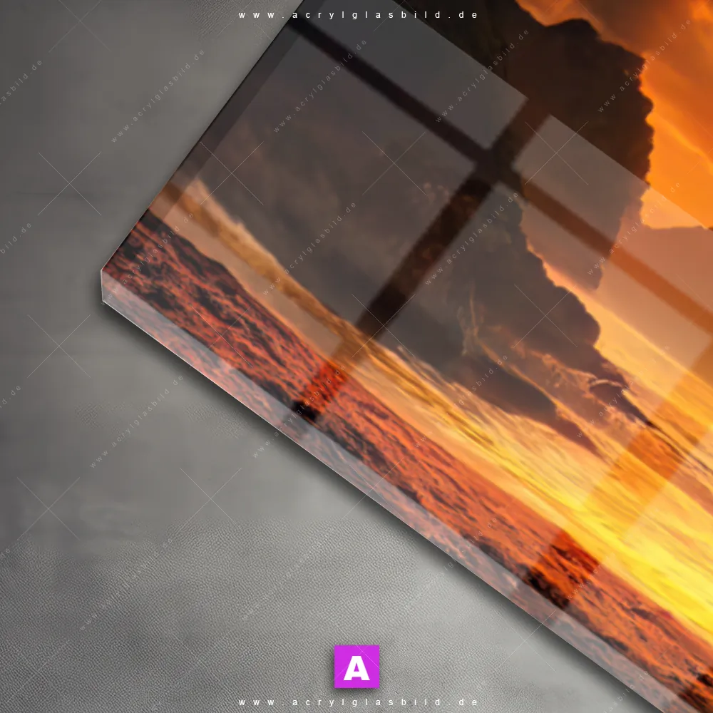 Also, worauf wartest du noch? Verwandle deine tristen Wände in Wohnzimmer - Schlafzimmer, Bar - Gastronomie, Büro - Kanzlei, Arzt - Praxis in inspirierende Kunstwerke aus der Kategorie Landschaften, Strand - Meer und bestelle jetzt das Acrylglasbild Feuerhimmel über dem Ozean!