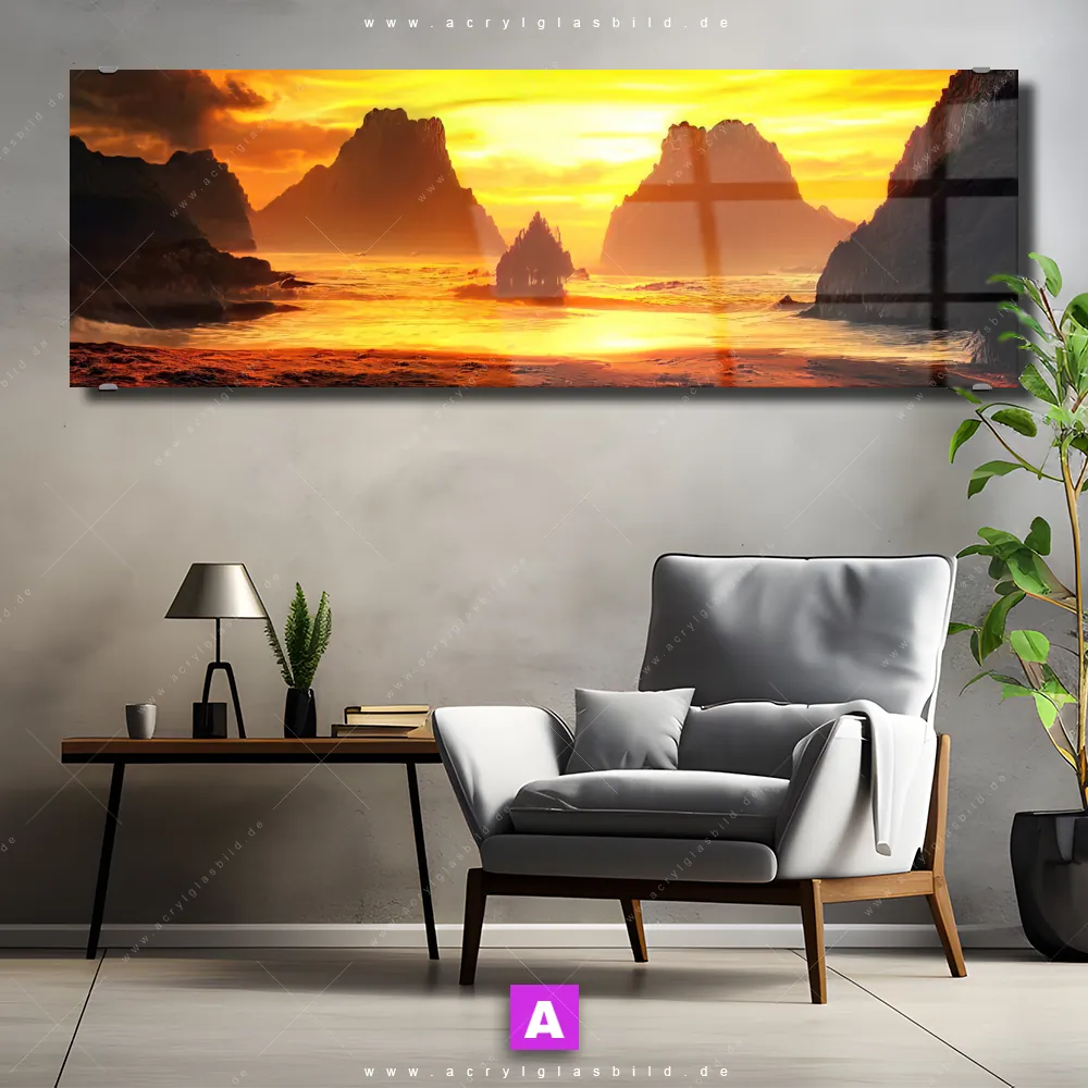<b>Produktart:</b> Acrylglasbild | Glasbild | Wandbild aus Kunstglas | <b> Motiv:</b> Magische Steinlandschaft im Meer | <b> Bildausrichtung:</b> Panorama | <b> Max. Motiv-Größe:</b> 300cm breit | 300cm hoch | <b> Verfügbare Formate: </b> Quadrat, Querformat, Hochformat, Panorama, Schmal, Rund | <b> Kategorie:</b> Landschaften, Strand - Meer | <b> Farben:</b> Orange, Braun, Gold | <b> Kunstformen:</b> Fotografie | <b> Kunststile:</b> Natürlich - Realistisch