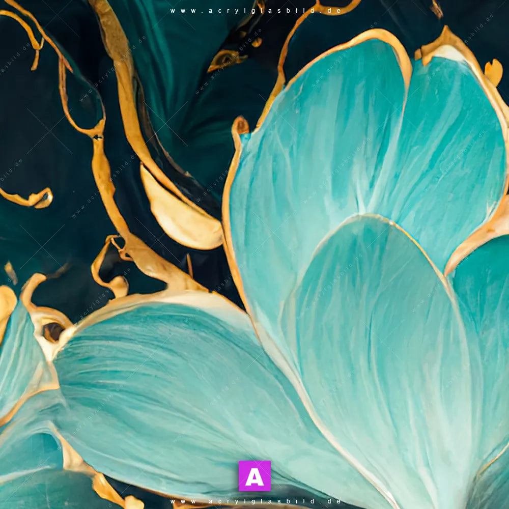 <b>Produktart:</b> Acrylglasbild | Glasbild | Wandbild aus Kunstglas | <b> Motiv:</b> Marmor Blüten in türkis & gold | <b> Bildausrichtung:</b> Querformat | <b> Max. Motiv-Größe:</b> 270cm breit | 150cm hoch | <b> Verfügbare Formate: </b> Quadrat, Querformat, Hochformat, Panorama, Schmal, Rund | <b> Kategorie:</b> Muster - Texturen, Blumen - Botanik | <b> Farben:</b> Schwarz, Gold, Türkis | <b> Kunstformen:</b> Kunst - Malerei | <b> Kunststile:</b> Abstrakt, Modern Art, Floral