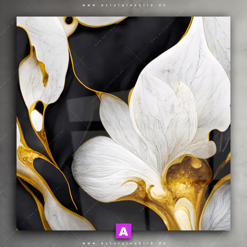 <b>Produktart:</b> Acrylglasbild | Glasbild | Wandbild aus Kunstglas | <b> Motiv:</b> Marmor Blüten in weiß & gold | <b> Bildausrichtung:</b> Quadrat | <b> Max. Motiv-Größe:</b> 270cm breit | 150cm hoch | <b> Verfügbare Formate: </b> Quadrat, Querformat, Hochformat, Panorama, Schmal, Rund | <b> Kategorie:</b> Muster - Texturen, Blumen - Botanik | <b> Farben:</b> Schwarz, Gold, Weiss | <b> Kunstformen:</b> Kunst - Malerei | <b> Kunststile:</b> Abstrakt, Modern Art, Floral