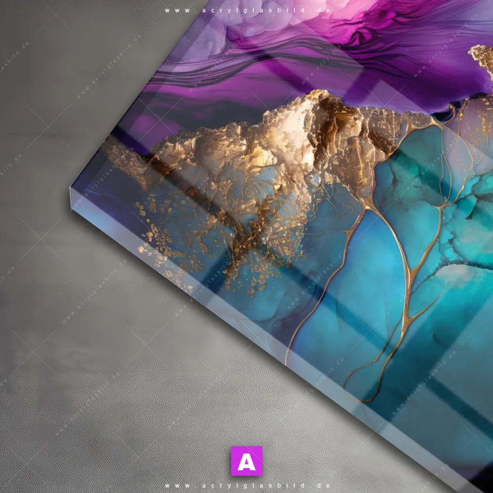 Das Motiv Marmorstruktur Lavendel wird im UV-Direktdruck in den Farben Lila, Blau, Gold, Türkis auf die Rückseite einer 5mm starken, transparenten Acrylglasplatte gedruckt. Das durchscheinende Motiv Goldener Lavendel in Marmoroptik im Abstrakt, Modern Art Stil wird anschließend vollflächig mit einer weißen Schicht hinterlegt. Das Muster - Texturen Acrylglasbild | Quadrat erhält so eine bemerkenswerte Farbbrillanz, hohe Schärfe und erstaunliche Tiefenwirkung.