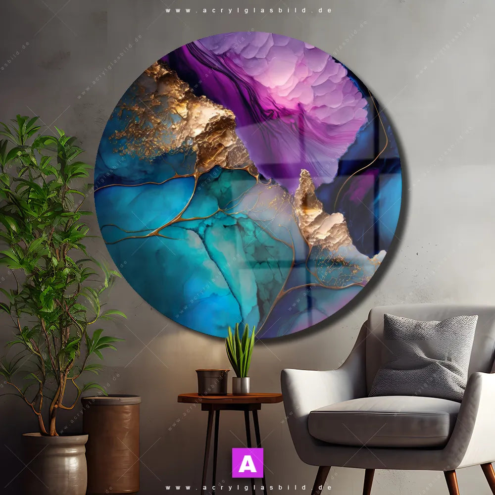 Das Motiv Marmorstruktur Lavendel wird im UV-Direktdruck in den Farben Lila, Blau, Gold, Türkis auf die Rückseite einer 5mm starken, transparenten Acrylglasplatte gedruckt. Das durchscheinende Motiv Goldener Lavendel in Marmoroptik im Abstrakt, Modern Art Stil wird anschließend vollflächig mit einer weißen Schicht hinterlegt. Das Muster - Texturen Acrylglasbild | Rund erhält so eine bemerkenswerte Farbbrillanz, hohe Schärfe und erstaunliche Tiefenwirkung.