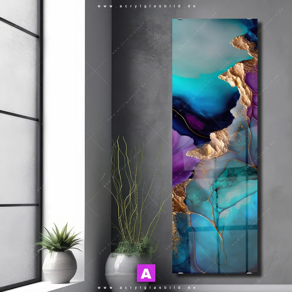 Die einzigartigen Farben in Lila, Blau, Gold, Türkis machen das Acrylglasbild Fluid Art in lila, blau & gold mit Marmor, Flüssigkeit, Acryl, flüssig, Farbe, Marmorierung, Tinte, Fluid Art zu einem echten Hingucker. Egal ob deine Einrichtung minimalistisch, modern oder doch eher wild und ausgefallen ist - unser Acrylglasbild Goldener Lavendel in Marmoroptik im Abstrakt, Modern Art Stil passt immer, auch in Arzt - Praxis, Büro - Kanzlei, Wohnzimmer - Schlafzimmer, Bar - Gastronomie, Friseur - Beauty, Flur - Eingangsbereich.