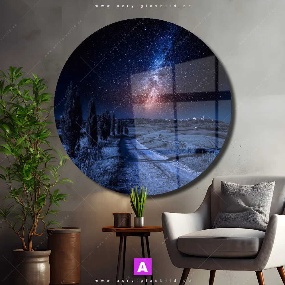 <b>Produktart:</b> Acrylglasbild | Glasbild | Wandbild aus Kunstglas | <b> Motiv:</b> Milchstraße über einem Feldweg | <b> Bildausrichtung:</b> Rund | <b> Max. Motiv-Größe:</b> 305cm breit | 300cm hoch | <b> Verfügbare Formate: </b> Quadrat, Querformat, Hochformat, Panorama, Schmal, Rund | <b> Kategorie:</b> Landschaften | <b> Farben:</b> Weiss, Schwarz, Blau, Braun, Ocker, Hellblau | <b> Kunstformen:</b> Fotografie | <b> Kunststile:</b> Natürlich - Realistisch