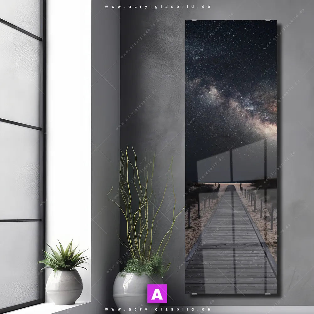 <b>Produktart:</b> Acrylglasbild | Glasbild | Wandbild aus Kunstglas | <b> Motiv:</b> Milchstraße über einem Holzweg | <b> Bildausrichtung:</b> Schmal | <b> Max. Motiv-Größe:</b> 300cm breit | 300cm hoch | <b> Verfügbare Formate: </b> Quadrat, Querformat, Hochformat, Panorama, Schmal, Rund | <b> Kategorie:</b> Landschaften, Strand - Meer | <b> Farben:</b> Weiss, Schwarz, Blau, Braun | <b> Kunstformen:</b> Fotografie | <b> Kunststile:</b> Natürlich - Realistisch