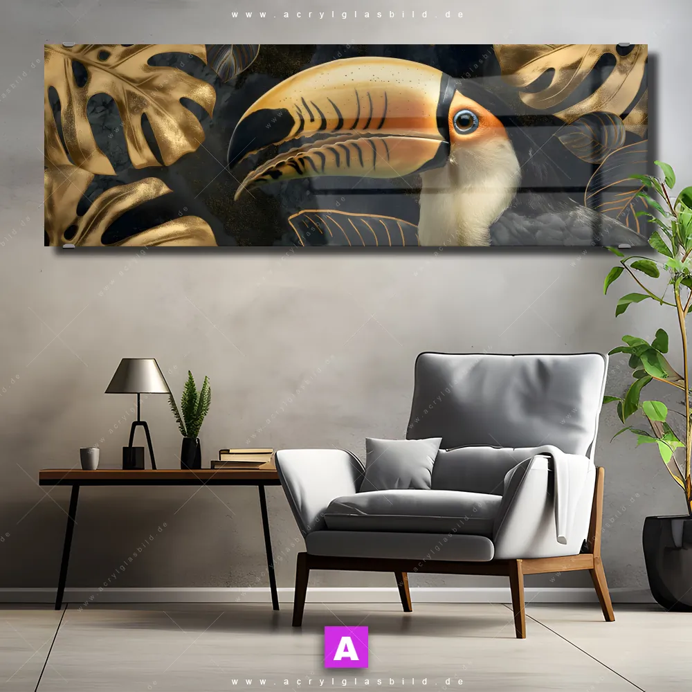 Fehlt dir die Inspiration beim Anblick deiner Wände, sodass selbst das Zählen der Wandfarbtropfen aufregender erscheint? Keine Sorge, wir haben das perfekte Kunstwerk für dich! Mit unserem Acrylglasbild Monstera und Tukan Gold im Panorama-Format verleihst du deinem Raum den dringend benötigten Wow-Faktor. Lass deine Wände mit unserem Tropischer Vogel in Gold Acrylglasbild zum Star werden!