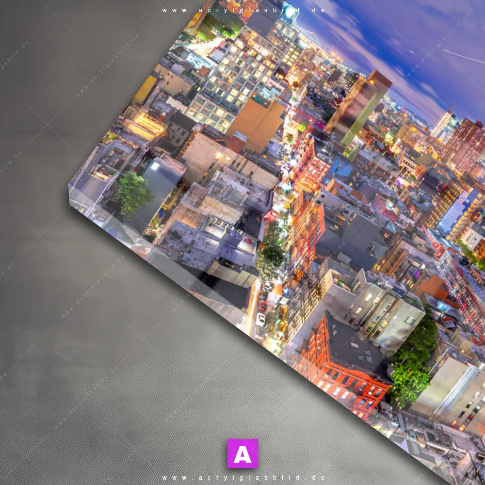 Das Motiv New York Skyline wird im UV-Direktdruck in den Farben Bunt auf die Rückseite einer 5mm starken, transparenten Acrylglasplatte gedruckt. Das durchscheinende Motiv Lichtermeer von New York im Natürlich - Realistisch Stil wird anschließend vollflächig mit einer weißen Schicht hinterlegt. Das Architektur - Gebäude, Städte - Skylines Acrylglasbild | Querformat erhält so eine bemerkenswerte Farbbrillanz, hohe Schärfe und erstaunliche Tiefenwirkung.