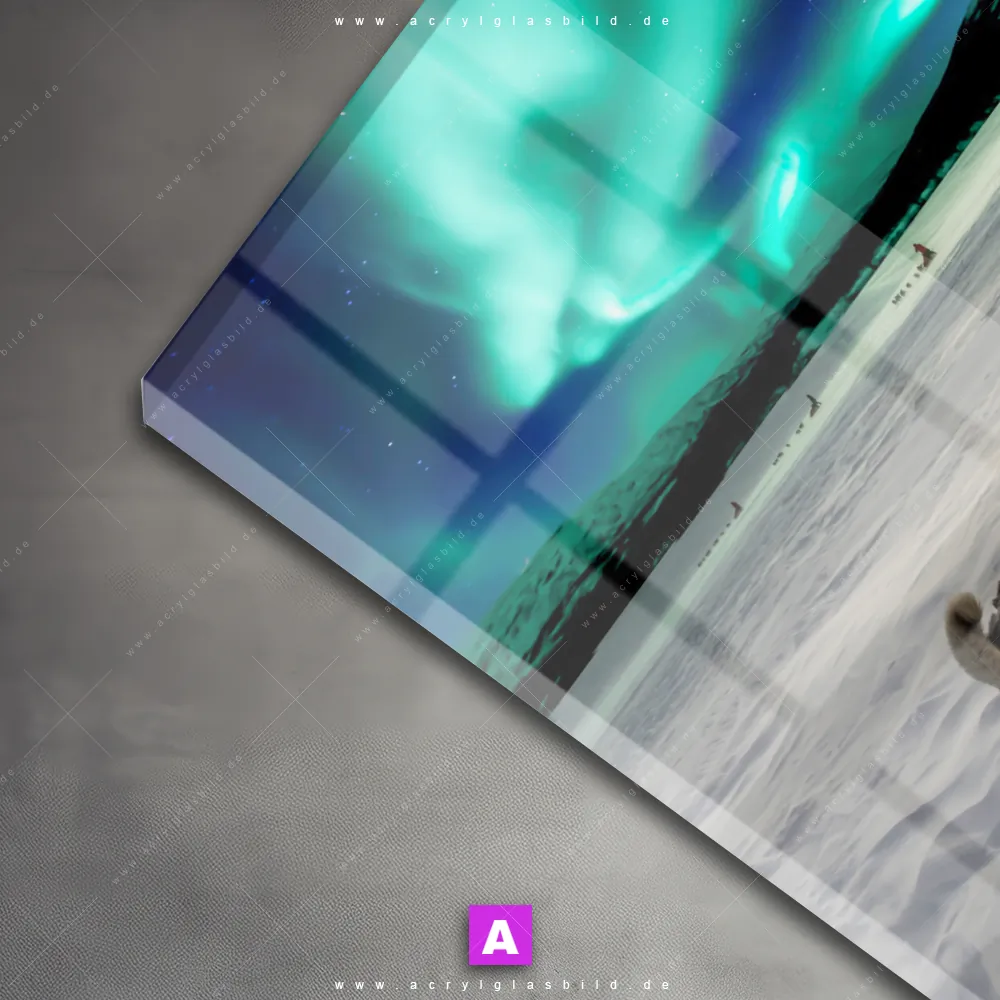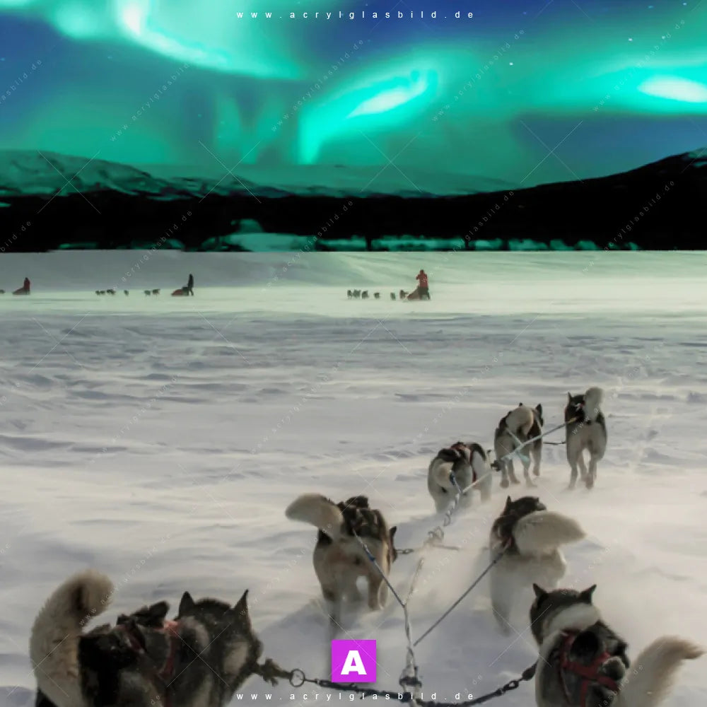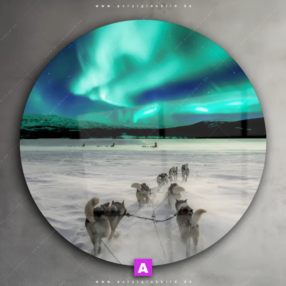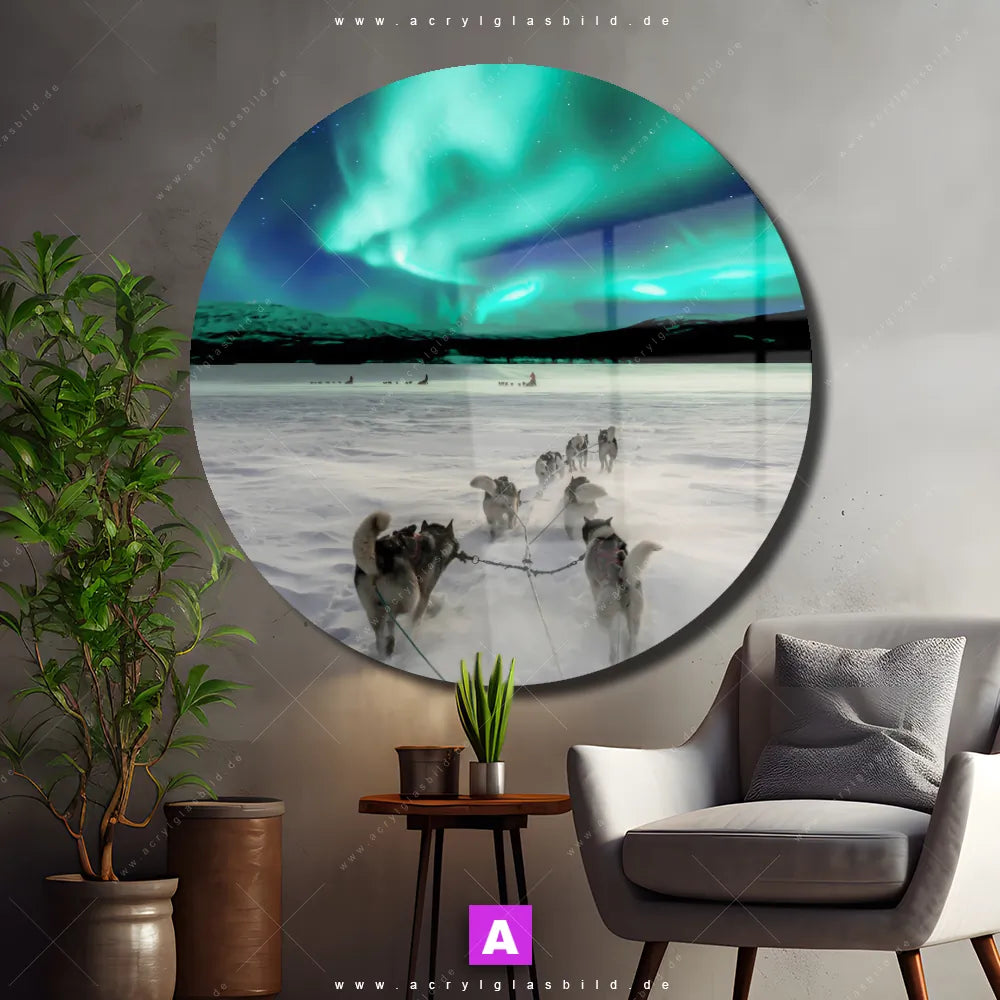 Hey du! Bist du es auch leid, auf langweilige, weiße Wände in deinem Raum zu starren und dich zu fragen, ob das der Sinn des Lebens ist? Unser Acrylglasbild mit dem Titel Nordlichter und Schlittenhunde im Format Rund verwandelt deine Wand in ein Kunstwerk und macht deinen Raum zum absoluten Hingucker.