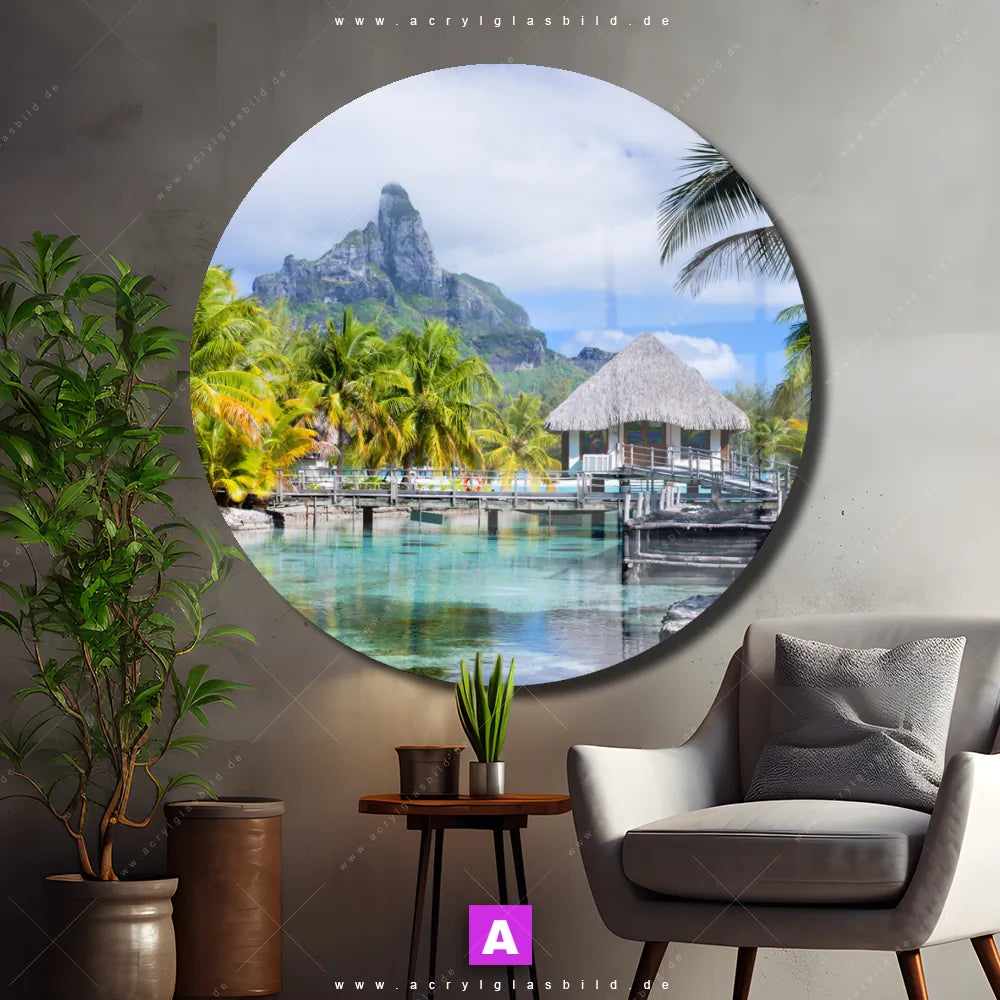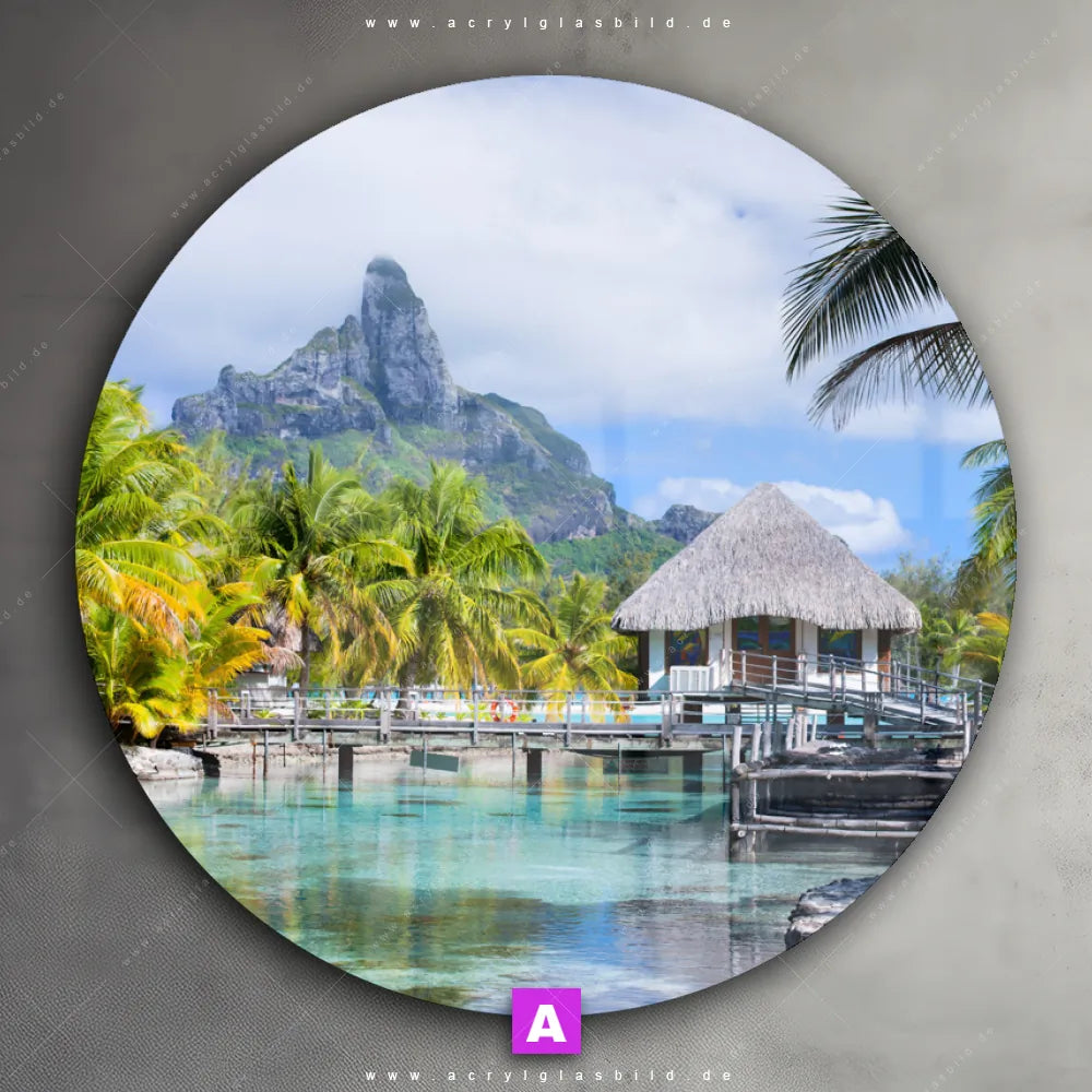 Hey du! Bist du es auch leid, auf langweilige, weiße Wände in deinem Raum zu starren und dich zu fragen, ob das der Sinn des Lebens ist? Unser Acrylglasbild mit dem Titel Palmen & Berg auf Insel im Format Rund verwandelt deine Wand in ein Kunstwerk und macht deinen Raum zum absoluten Hingucker.