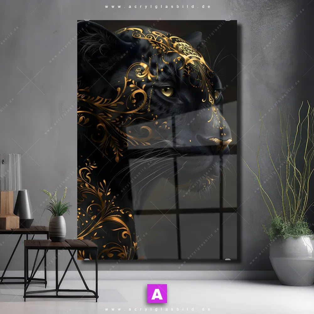 Hallo, auf Wiedersehen langweilige Wände! Gib deinem Raum ein stilvolles Upgrade mit unserem Acrylglasbild Panther mit goldenen Ornamenten im Hochformat, das nicht nur Büro - Kanzlei, Wohnzimmer - Schlafzimmer, Flur - Eingangsbereich, sondern auch jeden anderen Raum im Handumdrehen auf ein neues Niveau hebt!