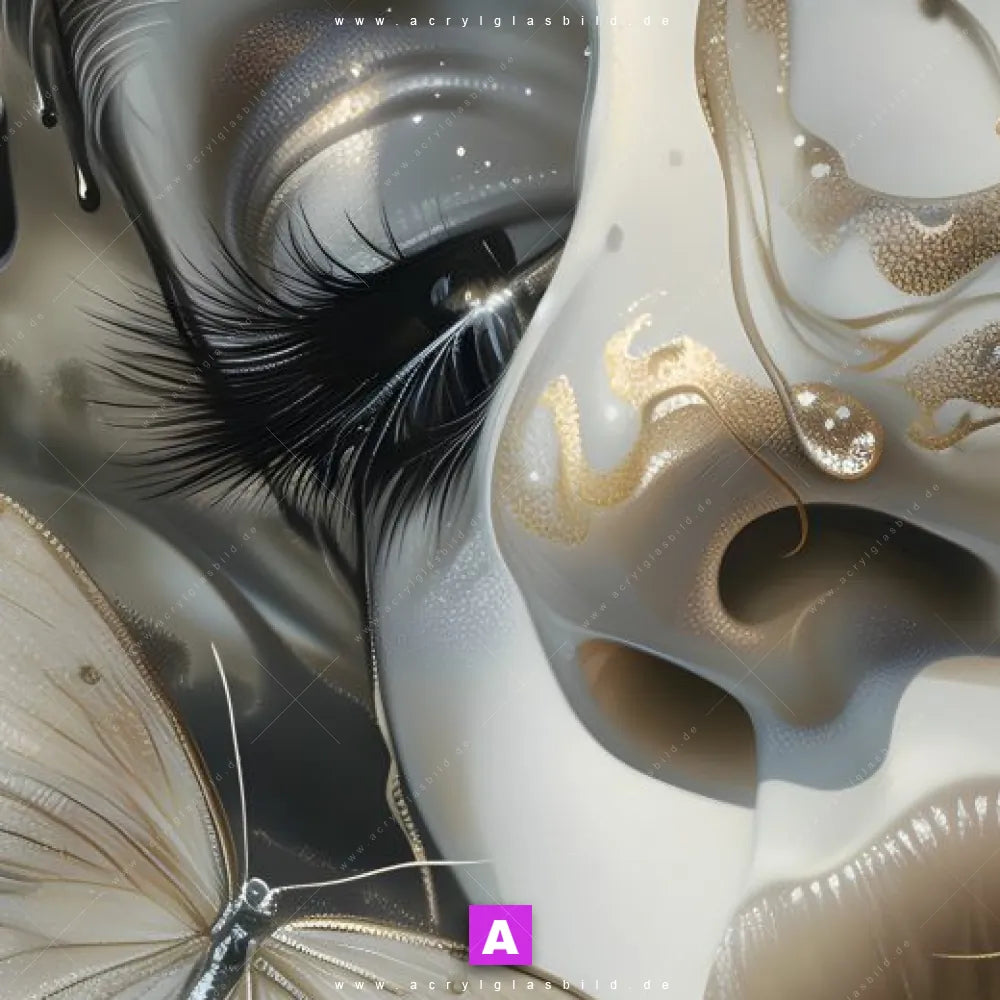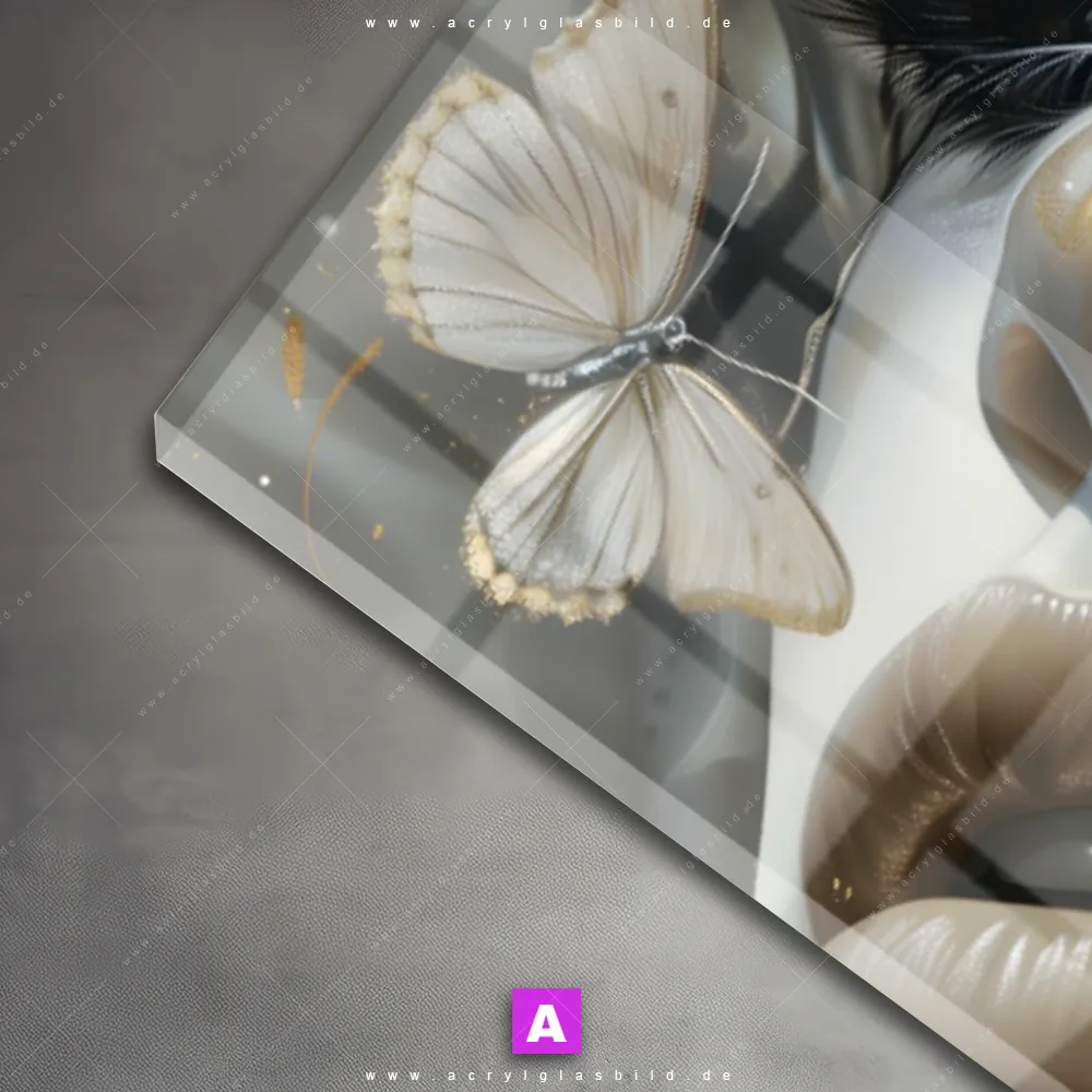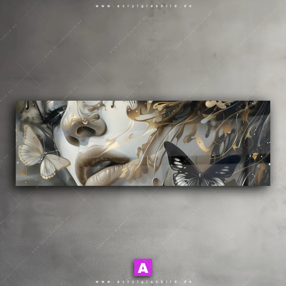 <b>Produktart:</b> Acrylglasbild | Glasbild | Wandbild aus Kunstglas | <b> Motiv:</b> Paola - Porträt mit Schmetterlingen | <b> Bildausrichtung:</b> Panorama | <b> Max. Motiv-Größe:</b> 450cm breit | 300cm hoch | <b> Verfügbare Formate: </b> Quadrat, Querformat, Hochformat, Panorama, Schmal, Rund | <b> Kategorie:</b> Porträts - Menschen | <b> Farben:</b> Gold, Grau , Schwarz, Beige | <b> Kunstformen:</b> Kunst - Malerei | <b> Kunststile:</b> Modern Art, Abstrakt