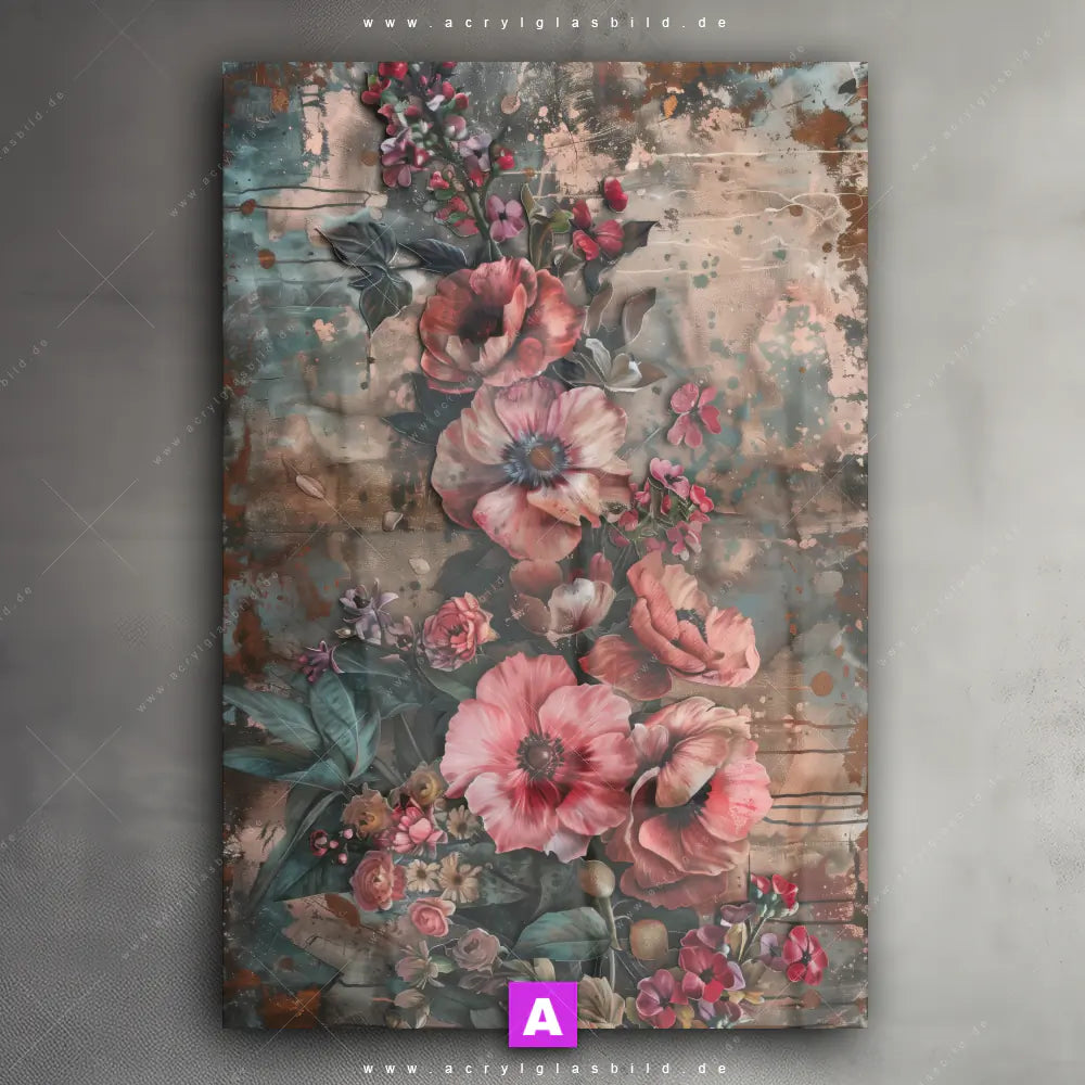 <b>Produktart:</b> Acrylglasbild | Glasbild | Wandbild aus Kunstglas | <b> Motiv:</b> Romantische Vintageblumen | <b> Bildausrichtung:</b> Hochformat | <b> Max. Motiv-Größe:</b> 410cm breit | 275cm hoch | <b> Verfügbare Formate: </b> Quadrat, Querformat, Hochformat, Panorama, Schmal, Rund | <b> Kategorie:</b> Blumen - Botanik | <b> Farben:</b> Rosa, Rot, Grün, Braun | <b> Kunstformen:</b> Digitale Kunst, Kunst - Malerei | <b> Kunststile:</b> Floral, Retro - Vintage, Grunge