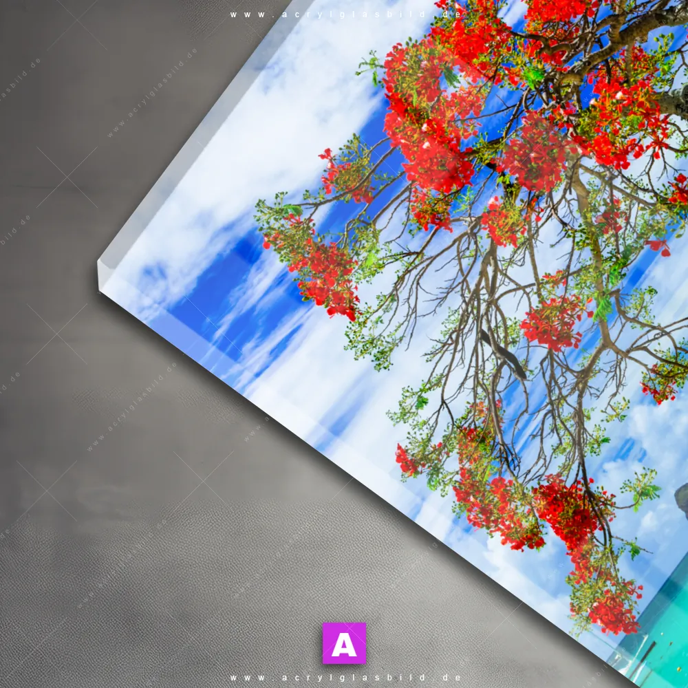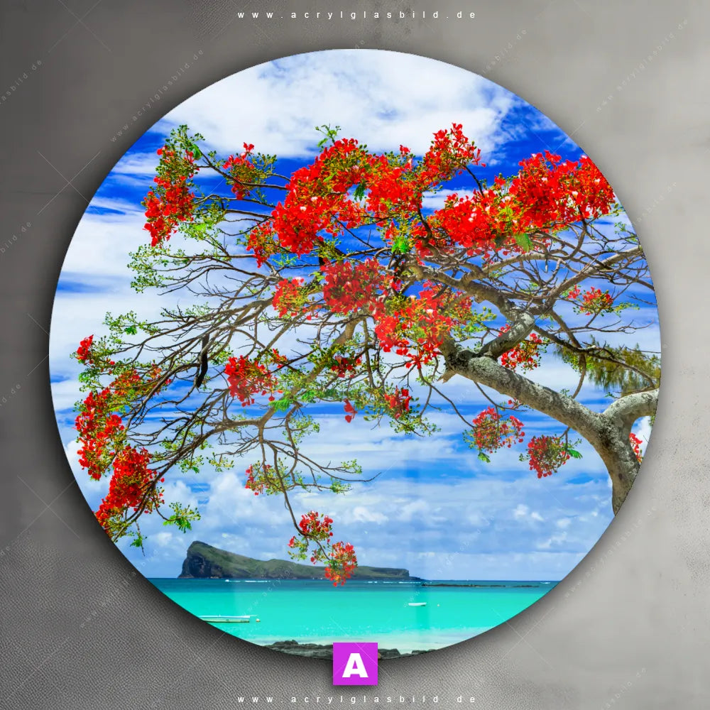 <b>Produktart:</b> Acrylglasbild | Glasbild | Wandbild aus Kunstglas | <b> Motiv:</b> Rote Blüten und Türkisfarbenes Meer | <b> Bildausrichtung:</b> Rund | <b> Max. Motiv-Größe:</b> 450cm breit | 300cm hoch | <b> Verfügbare Formate: </b> Quadrat, Querformat, Hochformat, Panorama, Schmal, Rund | <b> Kategorie:</b> Landschaften, Strand - Meer | <b> Farben:</b> Blau, Rot, Türkis | <b> Kunstformen:</b> Fotografie | <b> Kunststile:</b> Natürlich - Realistisch