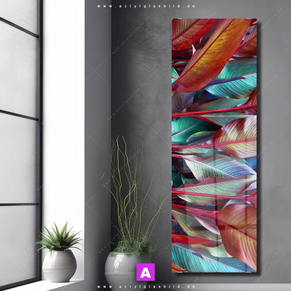 Die einzigartigen Farben in Rot, Grün, Mint, Orange machen das Acrylglasbild Pflanzenblätter in rot und blau-grün mit Blätter, Pflanze, Natur, Nahaufnahme, Blatt, Laub, Dschungel zu einem echten Hingucker. Egal ob deine Einrichtung minimalistisch, modern oder doch eher wild und ausgefallen ist - unser Acrylglasbild Blätter in Konstrastfarben im Floral, Modern Art Stil passt immer, auch in Arzt - Praxis, Büro - Kanzlei, Wohnzimmer - Schlafzimmer, Flur - Eingangsbereich, Badezimmer, Bar - Gastronomie.