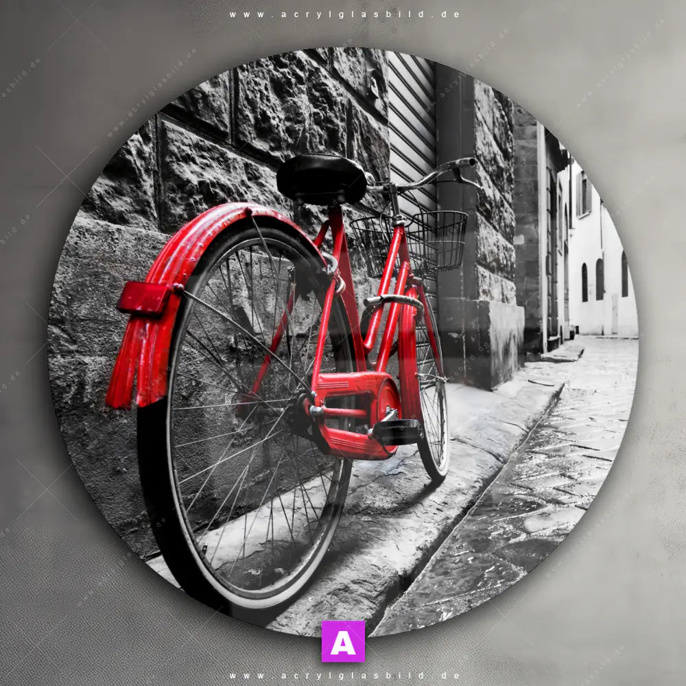<b>Produktart:</b> Acrylglasbild | Glasbild | Wandbild aus Kunstglas | <b> Motiv:</b> Rotes Fahrrad in Gasse | <b> Bildausrichtung:</b> Rund | <b> Max. Motiv-Größe:</b> 180cm breit | 180cm hoch | <b> Verfügbare Formate: </b> Quadrat, Querformat, Hochformat, Panorama, Schmal, Rund | <b> Kategorie:</b> Fahrzeuge, Städte - Skylines | <b> Farben:</b> Schwarz, Weiss, Grau , Rot | <b> Kunstformen:</b> Fotografie | <b> Kunststile:</b> Retro - Vintage, Schwarz - Weiss