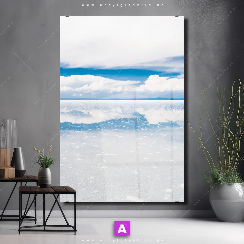 <b>Produktart:</b> Acrylglasbild | Glasbild | Wandbild aus Kunstglas | <b> Motiv:</b> Salzsee in Bolivien | <b> Bildausrichtung:</b> Hochformat | <b> Max. Motiv-Größe:</b> 270cm breit | 180cm hoch | <b> Verfügbare Formate: </b> Quadrat, Querformat, Hochformat, Panorama, Schmal, Rund | <b> Kategorie:</b> Landschaften | <b> Farben:</b> Weiss, Blau, Hellblau | <b> Kunstformen:</b> Fotografie | <b> Kunststile:</b> Natürlich - Realistisch, Minimalistisch