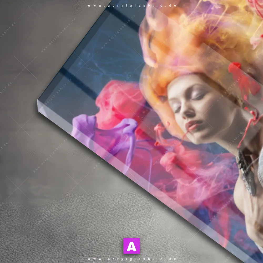 Das Motiv Schlafende Nixe wird im UV-Direktdruck in den Farben Blau, Orange, Lila auf die Rückseite einer 5mm starken, transparenten Acrylglasplatte gedruckt. Das durchscheinende Motiv Farbexplosionen im Modern Art, Mixed Media Stil wird anschließend vollflächig mit einer weißen Schicht hinterlegt. Das Porträts - Menschen Acrylglasbild | Schmal erhält so eine bemerkenswerte Farbbrillanz, hohe Schärfe und erstaunliche Tiefenwirkung.