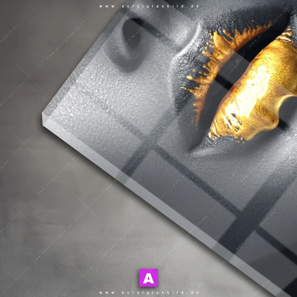 Das Motiv Schönheit in Silber & Gold wird im UV-Direktdruck in den Farben Gold, Silber, Schwarz auf die Rückseite einer 5mm starken, transparenten Acrylglasplatte gedruckt. Das durchscheinende Motiv Goldener Farbfluss über silbernes Gesicht im Modern Art Stil wird anschließend vollflächig mit einer weißen Schicht hinterlegt. Das Porträts - Menschen Acrylglasbild | Quadrat erhält so eine bemerkenswerte Farbbrillanz, hohe Schärfe und erstaunliche Tiefenwirkung.