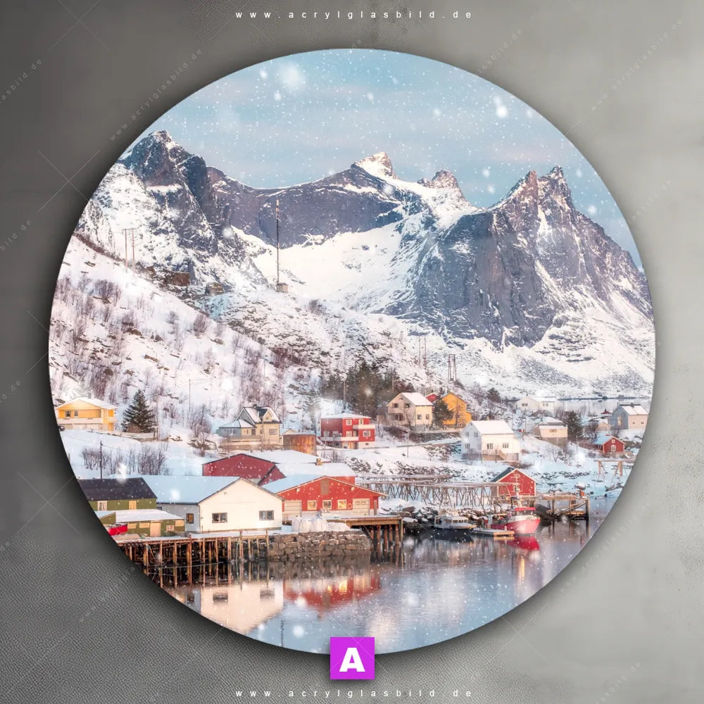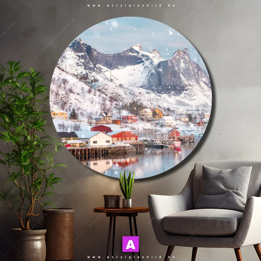Hey du! Bist du es auch leid, auf langweilige, weiße Wände in deinem Raum zu starren und dich zu fragen, ob das der Sinn des Lebens ist? Unser Acrylglasbild mit dem Titel Skandinavisches Dorf im Schnee im Format Rund verwandelt deine Wand in ein Kunstwerk und macht deinen Raum zum absoluten Hingucker.
