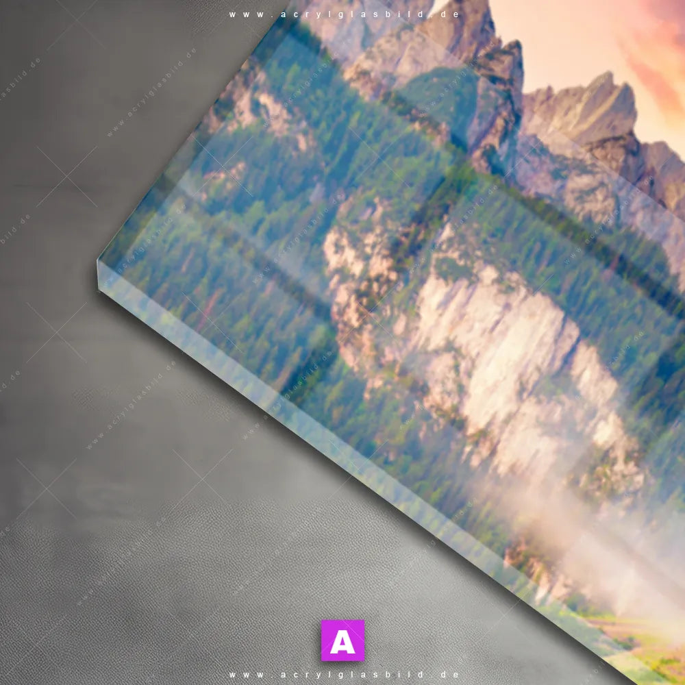 Das Motiv Sonnenaufgang am Bergsee wird im UV-Direktdruck in den Farben Bunt auf die Rückseite einer 5mm starken, transparenten Acrylglasplatte gedruckt. Das durchscheinende Motiv Boote am Ufer eines Bergsees im Natürlich - Realistisch Stil wird anschließend vollflächig mit einer weißen Schicht hinterlegt. Das Landschaften Acrylglasbild | Panorama erhält so eine bemerkenswerte Farbbrillanz, hohe Schärfe und erstaunliche Tiefenwirkung.