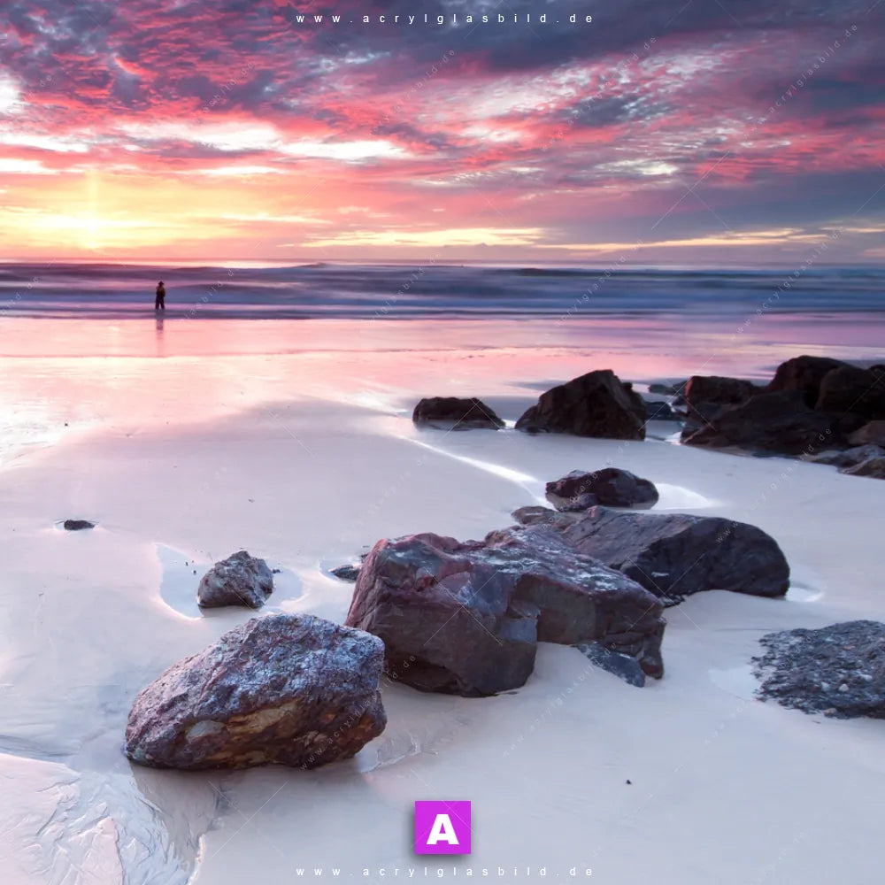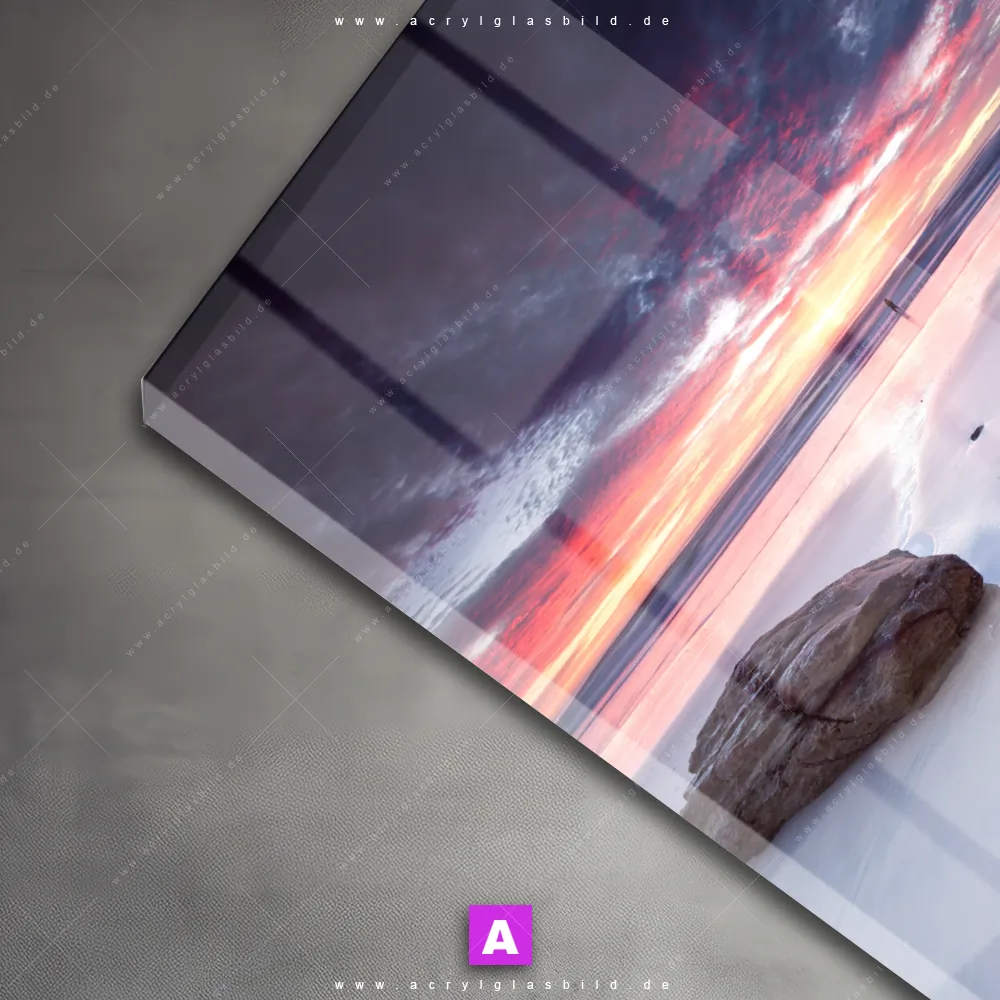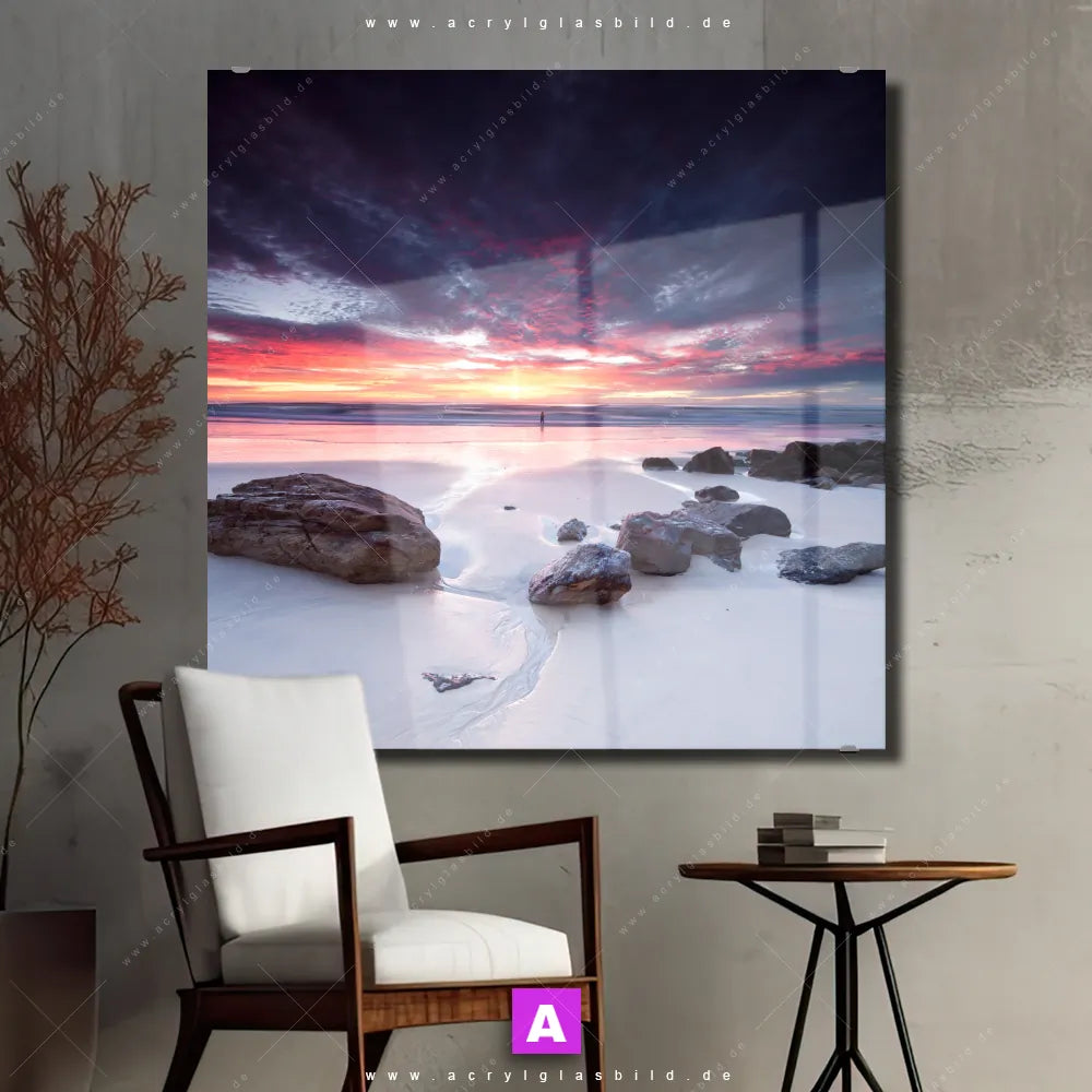 Das Motiv Sonnenaufgang am Strand mit Felsen wird im UV-Direktdruck in den Farben Lila, Orange, Weiss, Blau, Rot auf die Rückseite einer 5mm starken, transparenten Acrylglasplatte gedruckt. Das durchscheinende Motiv Felsen am Strand im Natürlich - Realistisch, Modern Art Stil wird anschließend vollflächig mit einer weißen Schicht hinterlegt. Das Landschaften, Strand - Meer Acrylglasbild | Quadrat erhält so eine bemerkenswerte Farbbrillanz, hohe Schärfe und erstaunliche Tiefenwirkung.