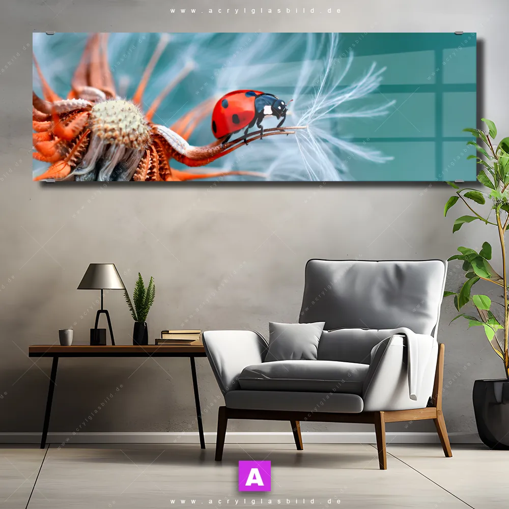 Also, worauf wartest du noch? Verwandle deine tristen Wände in Arzt - Praxis, Büro - Kanzlei, Wohnzimmer - Schlafzimmer, Flur - Eingangsbereich in inspirierende Kunstwerke aus der Kategorie Blumen - Botanik, Tierwelt und bestelle jetzt das Acrylglasbild Marienkäfer sitzt auf Pusteblume!