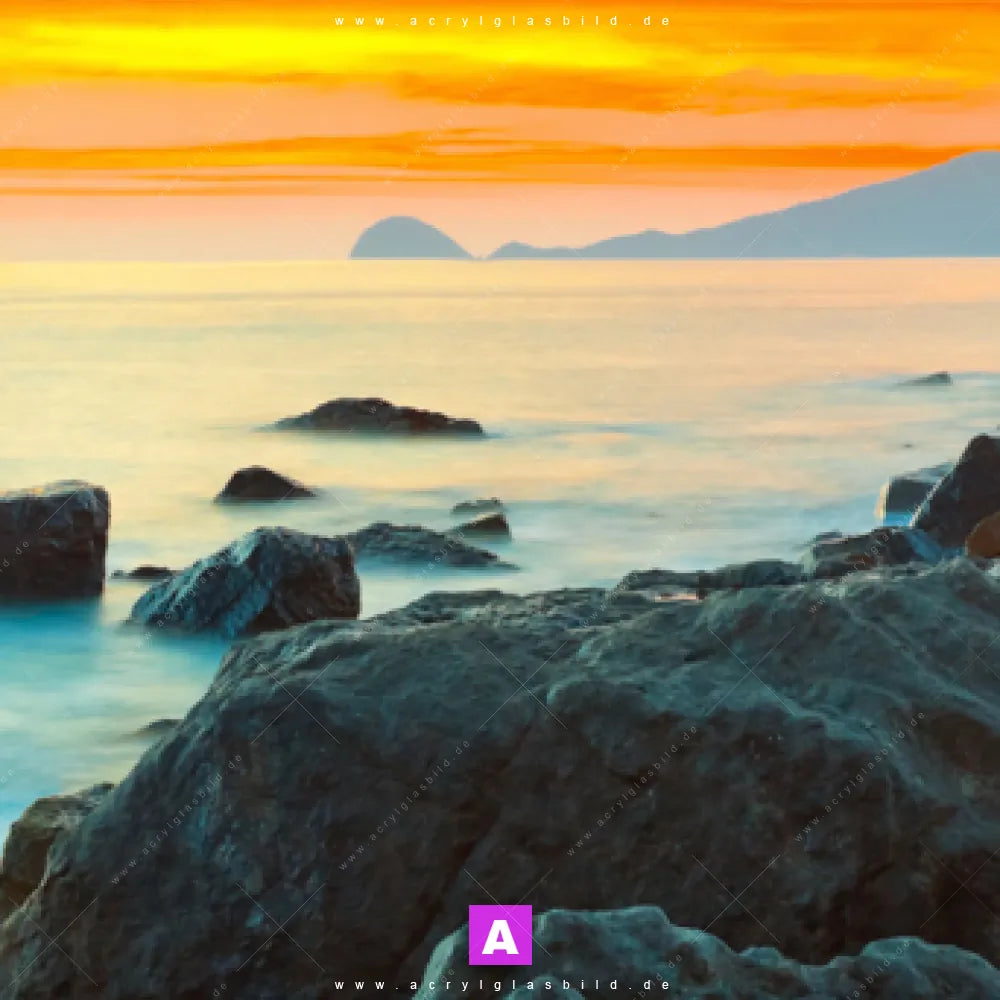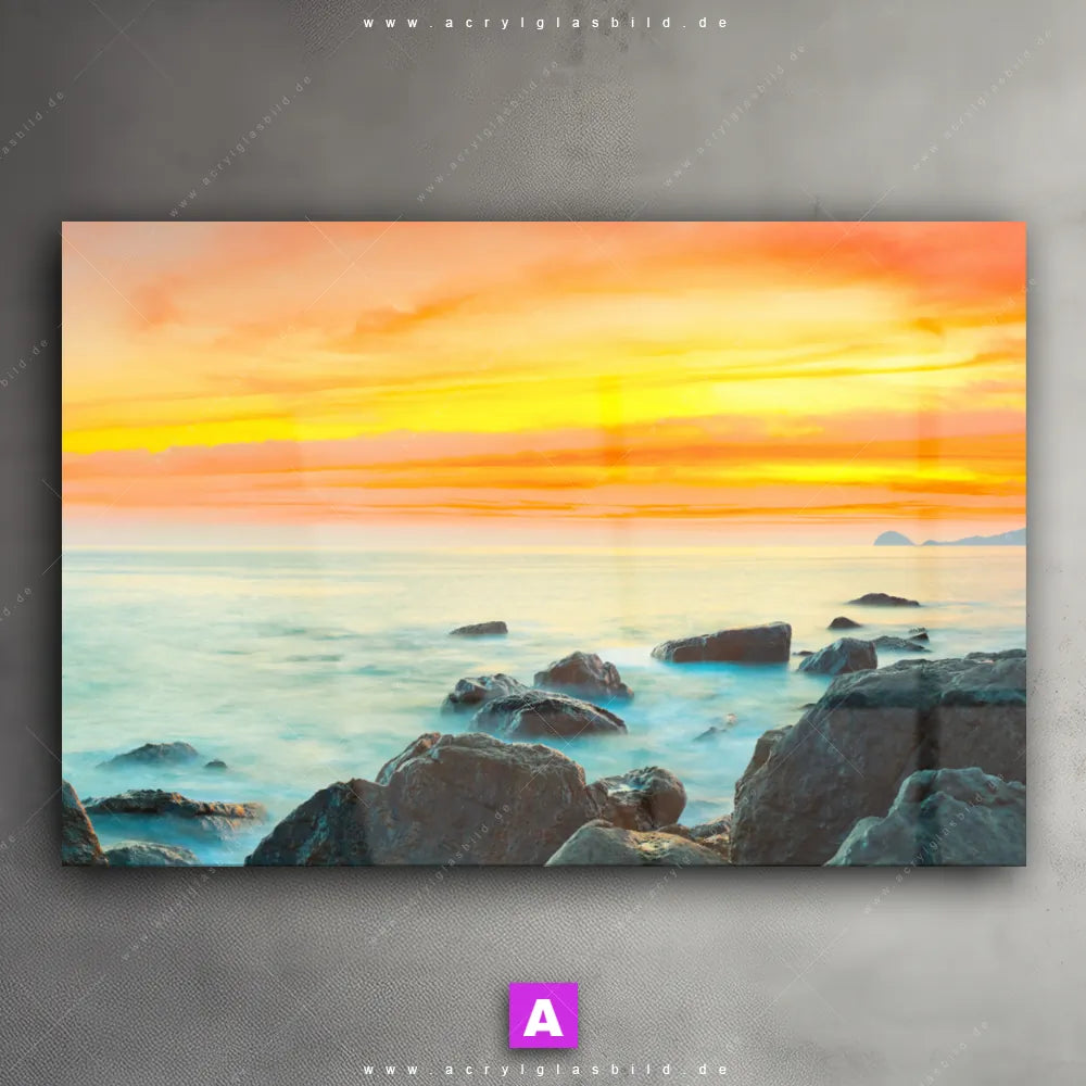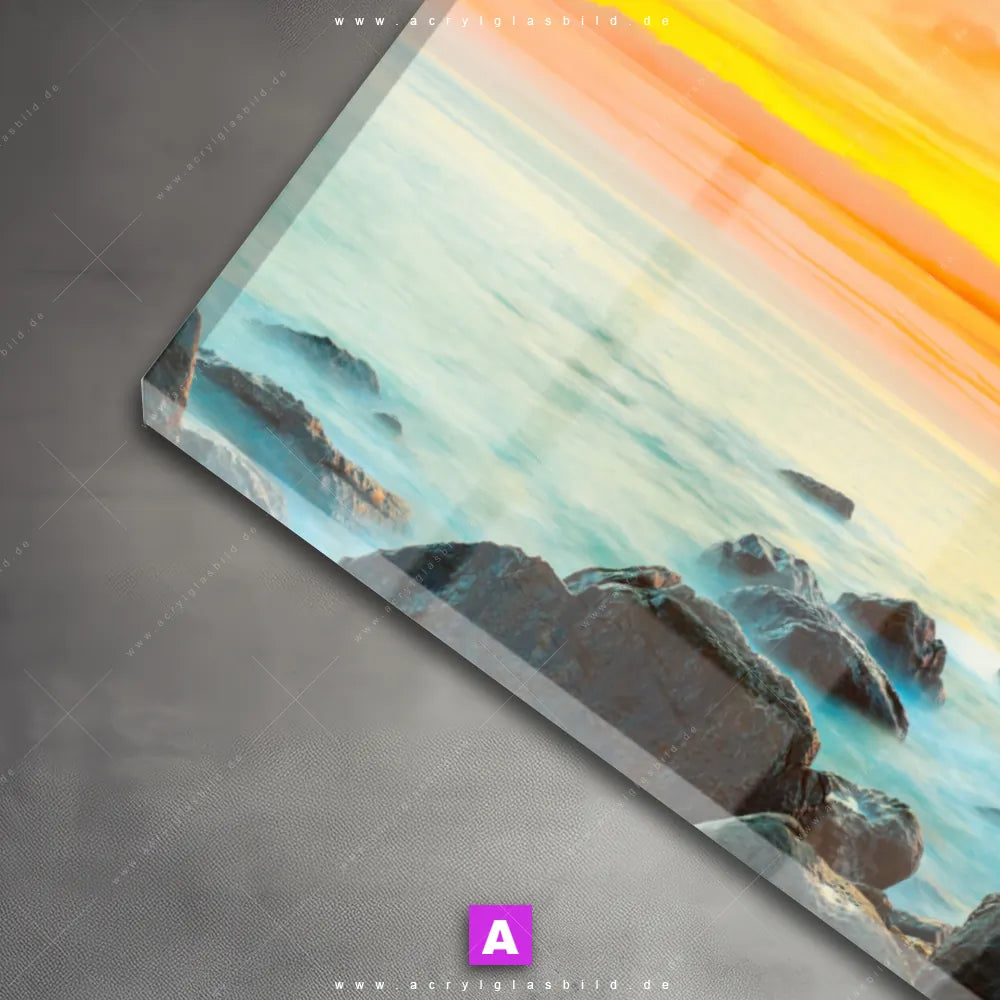 Das Motiv Sonnenuntergang über dem Meer wird im UV-Direktdruck in den Farben Orange, Türkis, Rot auf die Rückseite einer 5mm starken, transparenten Acrylglasplatte gedruckt. Das durchscheinende Motiv Sonnenuntergang an felsiger Küste im Modern Art Stil wird anschließend vollflächig mit einer weißen Schicht hinterlegt. Das Landschaften, Strand - Meer Acrylglasbild | Querformat erhält so eine bemerkenswerte Farbbrillanz, hohe Schärfe und erstaunliche Tiefenwirkung.