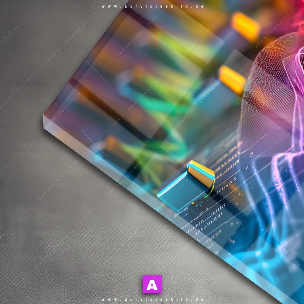 Das Motiv Sound Wave wird im UV-Direktdruck in den Farben Bunt auf die Rückseite einer 5mm starken, transparenten Acrylglasplatte gedruckt. Das durchscheinende Motiv Mischpult und Sound Wave Regenbogenfarben im Mixed Media, Pop Art, Modern Art Stil wird anschließend vollflächig mit einer weißen Schicht hinterlegt. Das Muster - Texturen, Sport - Freizeit Acrylglasbild | Quadrat erhält so eine bemerkenswerte Farbbrillanz, hohe Schärfe und erstaunliche Tiefenwirkung.