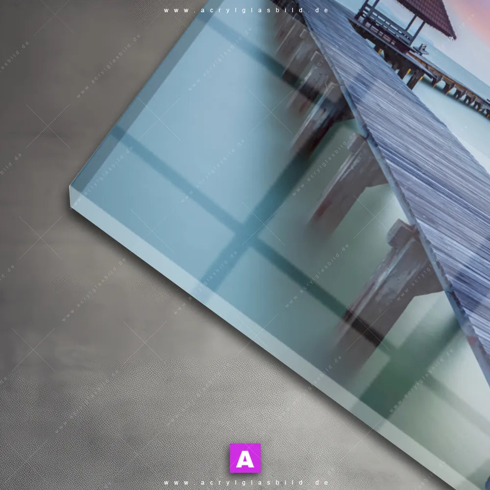 Das Motiv Steg ins Meer wird im UV-Direktdruck in den Farben Hellblau, Rosa auf die Rückseite einer 5mm starken, transparenten Acrylglasplatte gedruckt. Das durchscheinende Motiv Steg mit Holzhütten im Natürlich - Realistisch Stil wird anschließend vollflächig mit einer weißen Schicht hinterlegt. Das Strand - Meer, Landschaften Acrylglasbild | Querformat erhält so eine bemerkenswerte Farbbrillanz, hohe Schärfe und erstaunliche Tiefenwirkung.