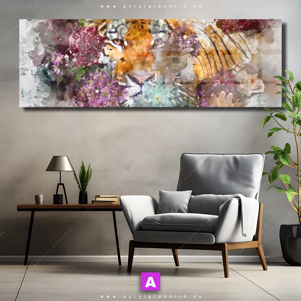 Fehlt dir die Inspiration beim Anblick deiner Wände, sodass selbst das Zählen der Wandfarbtropfen aufregender erscheint? Keine Sorge, wir haben das perfekte Kunstwerk für dich! Mit unserem Acrylglasbild Tiger & Blumen im Panorama-Format verleihst du deinem Raum den dringend benötigten Wow-Faktor. Lass deine Wände mit unserem Floraler Tiger Acrylglasbild zum Star werden!