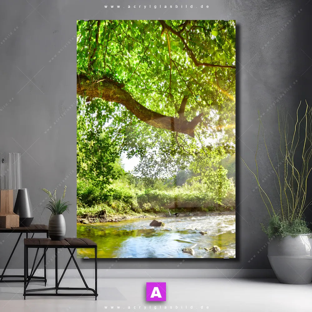 Hallo, auf Wiedersehen langweilige Wände! Gib deinem Raum ein stilvolles Upgrade mit unserem Acrylglasbild Wald mit Bach bei Sonnenschein im Hochformat, das nicht nur Arzt - Praxis, Büro - Kanzlei, Wohnzimmer - Schlafzimmer, Flur - Eingangsbereich, sondern auch jeden anderen Raum im Handumdrehen auf ein neues Niveau hebt!
