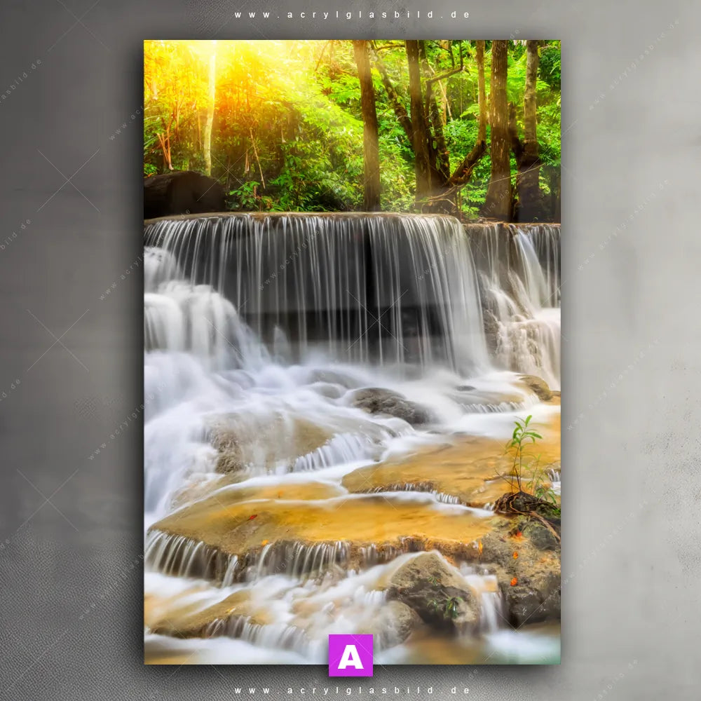 Wenn du auf der Suche nach einem Wandkunstwerk bist, das deine Sinne anregt und deine kreative Seite erweckt, dann ist unser Acrylglasbild Wasserfälle im Urwald aus der Kategorie Landschaften, Wald - Bäume die perfekte Wahl für dich. Entscheide dich für das Acrylglasbild Waldwasserfall bei Tagesanbruch in den faszinierenden Farben Türkis, Ocker, Gelb , Grün, da es ideal zu deinem Einrichtungsstil im Natürlich - Realistisch-Look passt.