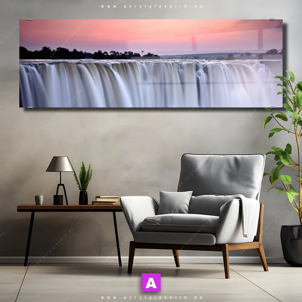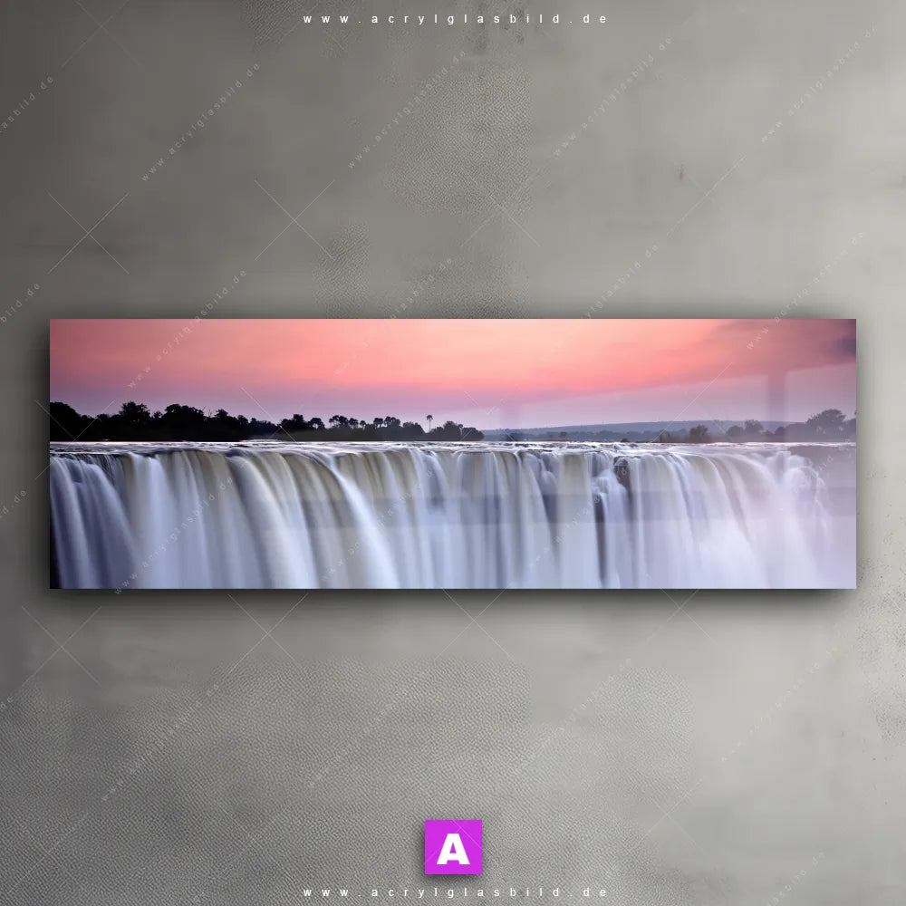 Fehlt dir die Inspiration beim Anblick deiner Wände, sodass selbst das Zählen der Wandfarbtropfen aufregender erscheint? Keine Sorge, wir haben das perfekte Kunstwerk für dich! Mit unserem Acrylglasbild Wasserfall bei Abendröte im Panorama-Format verleihst du deinem Raum den dringend benötigten Wow-Faktor. Lass deine Wände mit unserem Viktoriafälle Acrylglasbild zum Star werden!