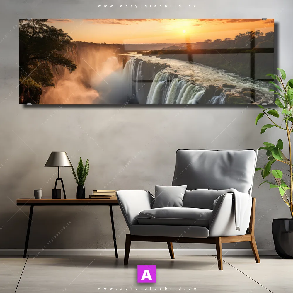 Fehlt dir die Inspiration beim Anblick deiner Wände, sodass selbst das Zählen der Wandfarbtropfen aufregender erscheint? Keine Sorge, wir haben das perfekte Kunstwerk für dich! Mit unserem Acrylglasbild Wasserfall bei Abendsonne im Panorama-Format verleihst du deinem Raum den dringend benötigten Wow-Faktor. Lass deine Wände mit unserem Wasserfall bei Sonnenuntergang Acrylglasbild zum Star werden!