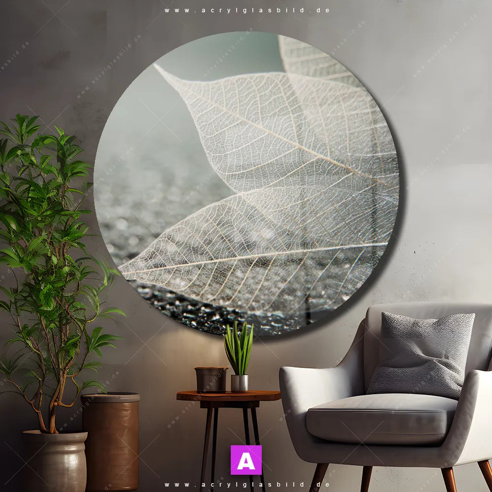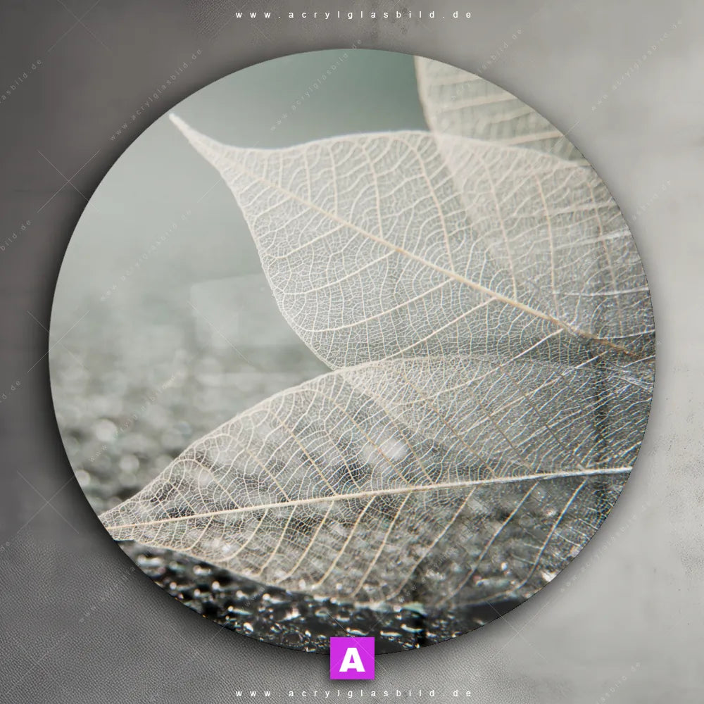 Das Motiv Weiße Blätter wird im UV-Direktdruck in den Farben Weiss, Schwarz, Grau auf die Rückseite einer 5mm starken, transparenten Acrylglasplatte gedruckt. Das durchscheinende Motiv Blätter mit Wassertropfen auf Stein im Modern Art, Floral Stil wird anschließend vollflächig mit einer weißen Schicht hinterlegt. Das Muster - Texturen, Blumen - Botanik Acrylglasbild | Rund erhält so eine bemerkenswerte Farbbrillanz, hohe Schärfe und erstaunliche Tiefenwirkung.