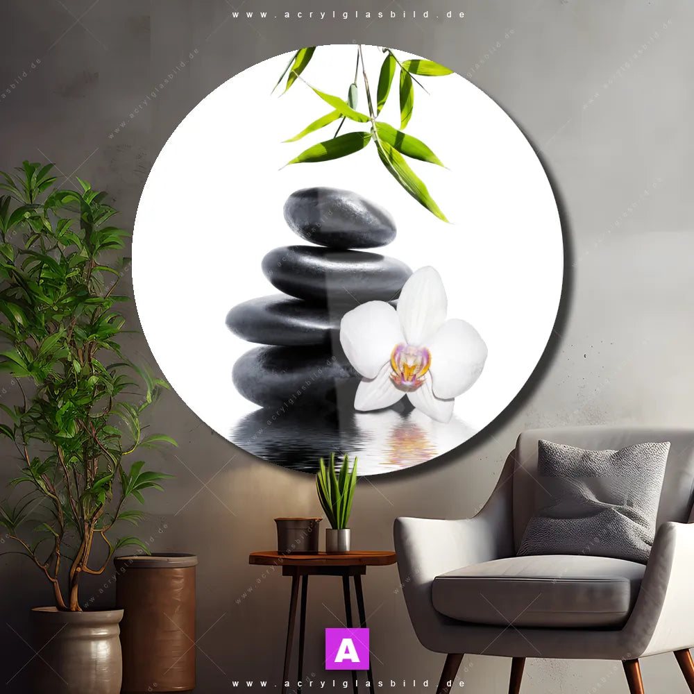 <b>Produktart:</b> Acrylglasbild | Glasbild | Wandbild aus Kunstglas | <b> Motiv:</b> Weiße Orchidee & Zensteine | <b> Bildausrichtung:</b> Rund | <b> Max. Motiv-Größe:</b> 200cm breit | 300cm hoch | <b> Verfügbare Formate: </b> Quadrat, Hochformat, Schmal, Rund | <b> Kategorie:</b> Buddha - Feng Shui, Blumen - Botanik | <b> Farben:</b> Grün, Weiss, Schwarz | <b> Kunstformen:</b> Fotografie, Digitale Kunst | <b> Kunststile:</b> Mixed Media, Modern Art, Floral