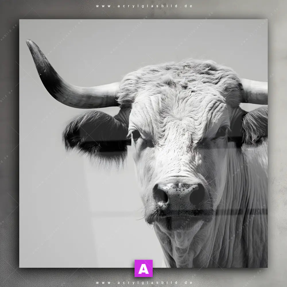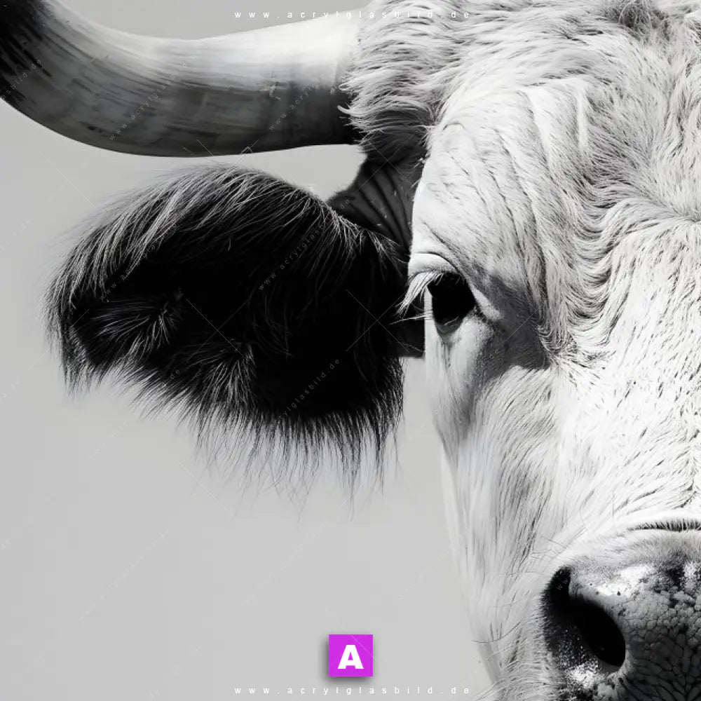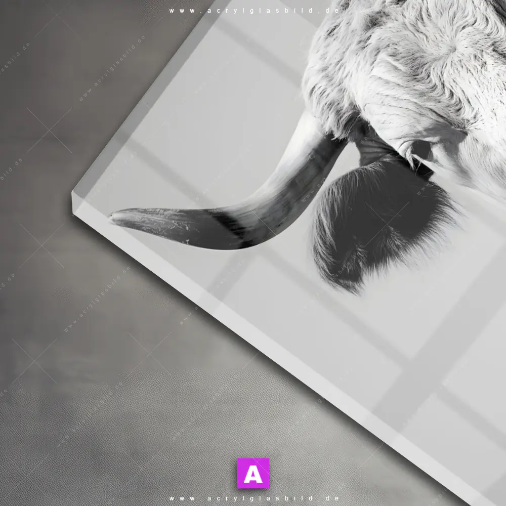 Das Motiv Weisser Bulle wird im UV-Direktdruck in den Farben Schwarz, Weiss auf die Rückseite einer 5mm starken, transparenten Acrylglasplatte gedruckt. Das durchscheinende Motiv Hochlandrind - Stärke und Ruhe im Natürlich - Realistisch, Schwarz - Weiss Stil wird anschließend vollflächig mit einer weißen Schicht hinterlegt. Das Tierwelt Acrylglasbild | Quadrat erhält so eine bemerkenswerte Farbbrillanz, hohe Schärfe und erstaunliche Tiefenwirkung.