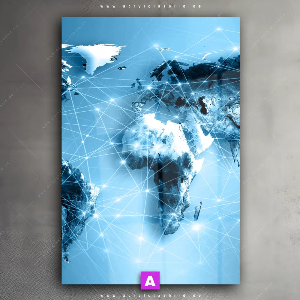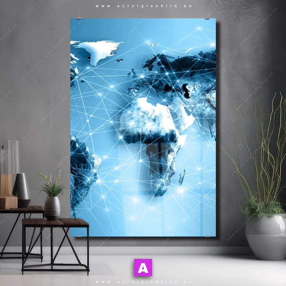 Hallo, auf Wiedersehen langweilige Wände! Gib deinem Raum ein stilvolles Upgrade mit unserem Acrylglasbild Weltkarte Kommunikation im Hochformat, das nicht nur Arzt - Praxis, Bar - Gastronomie, Büro - Kanzlei, Wohnzimmer - Schlafzimmer, sondern auch jeden anderen Raum im Handumdrehen auf ein neues Niveau hebt!