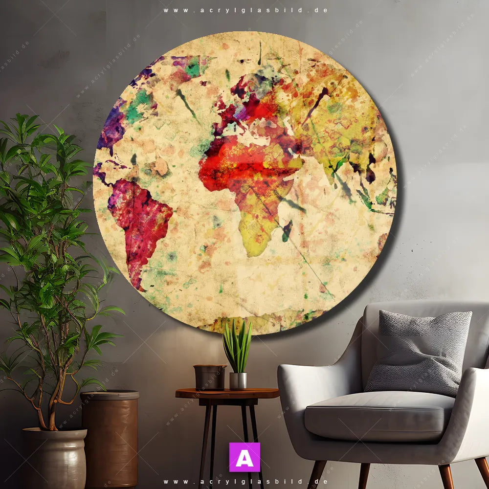 <b>Produktart:</b> Acrylglasbild | Glasbild | Wandbild aus Kunstglas | <b> Motiv:</b> Weltkarte Retro Bunt | <b> Bildausrichtung:</b> Rund | <b> Max. Motiv-Größe:</b> 270cm breit | 180cm hoch | <b> Verfügbare Formate: </b> Quadrat, Querformat, Hochformat, Panorama, Schmal, Rund | <b> Kategorie:</b> Karten | <b> Farben:</b> Bunt, Beige | <b> Kunstformen:</b> Digitale Kunst | <b> Kunststile:</b> Abstrakt, Grunge, Retro - Vintage, Modern Art