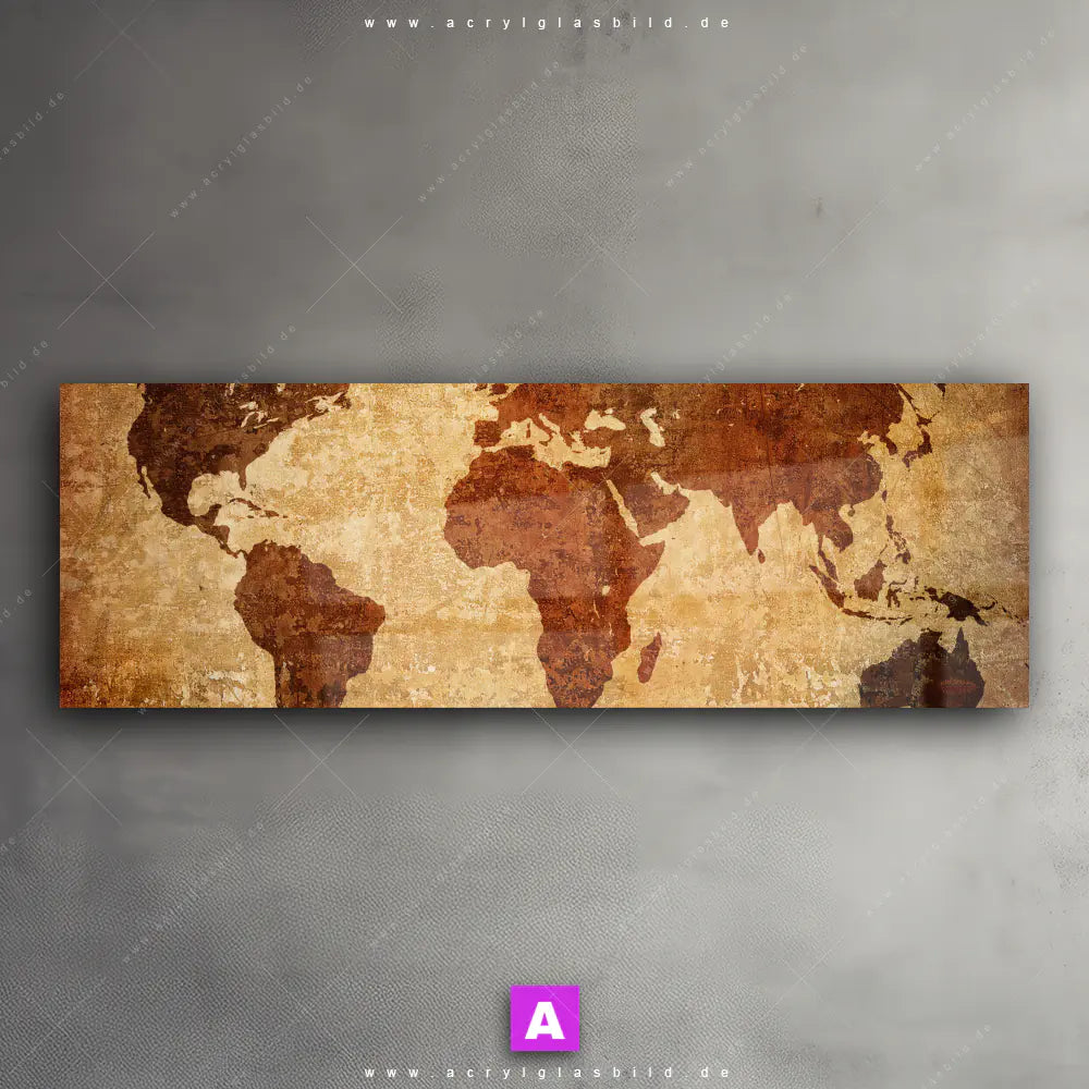 <b>Produktart:</b> Acrylglasbild | Glasbild | Wandbild aus Kunstglas | <b> Motiv:</b> Weltkarte Rostoptik | <b> Bildausrichtung:</b> Panorama | <b> Max. Motiv-Größe:</b> 180cm breit | 120cm hoch | <b> Verfügbare Formate: </b> Quadrat, Querformat, Hochformat, Panorama, Schmal, Rund | <b> Kategorie:</b> Karten | <b> Farben:</b> Braun, Beige | <b> Kunstformen:</b> Digitale Kunst | <b> Kunststile:</b> Retro - Vintage, Grunge