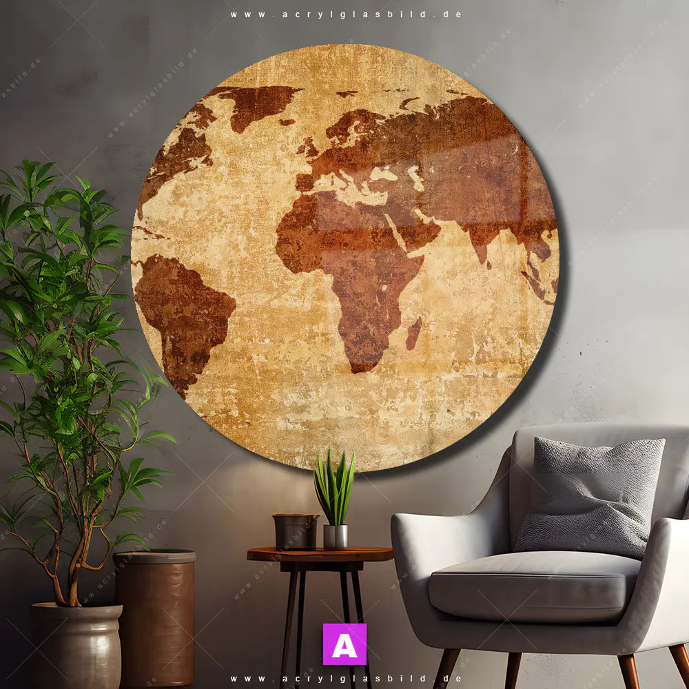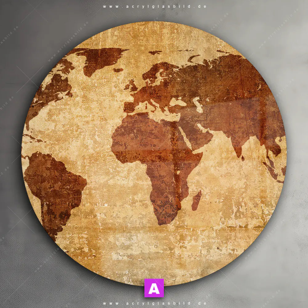 <b>Produktart:</b> Acrylglasbild | Glasbild | Wandbild aus Kunstglas | <b> Motiv:</b> Weltkarte Rostoptik | <b> Bildausrichtung:</b> Rund | <b> Max. Motiv-Größe:</b> 180cm breit | 120cm hoch | <b> Verfügbare Formate: </b> Quadrat, Querformat, Hochformat, Panorama, Schmal, Rund | <b> Kategorie:</b> Karten | <b> Farben:</b> Braun, Beige | <b> Kunstformen:</b> Digitale Kunst | <b> Kunststile:</b> Retro - Vintage, Grunge