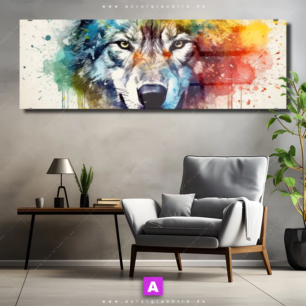 Also, worauf wartest du noch? Verwandle deine tristen Wände in Bar - Gastronomie, Wohnzimmer - Schlafzimmer, Büro - Kanzlei, Flur - Eingangsbereich in inspirierende Kunstwerke aus der Kategorie Tierwelt und bestelle jetzt das Acrylglasbild bunter Wolfskopf umgeben von Farbenpracht!