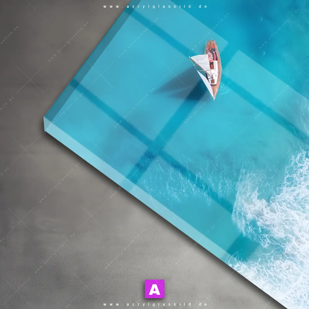 Das Motiv Yacht im Meer wird im UV-Direktdruck in den Farben Türkis, Blau, Beige, Weiss auf die Rückseite einer 5mm starken, transparenten Acrylglasplatte gedruckt. Das durchscheinende Motiv Boot in der Südsee im Modern Art Stil wird anschließend vollflächig mit einer weißen Schicht hinterlegt. Das Strand - Meer Acrylglasbild | Hochformat erhält so eine bemerkenswerte Farbbrillanz, hohe Schärfe und erstaunliche Tiefenwirkung.