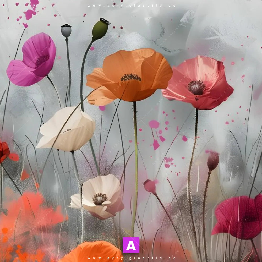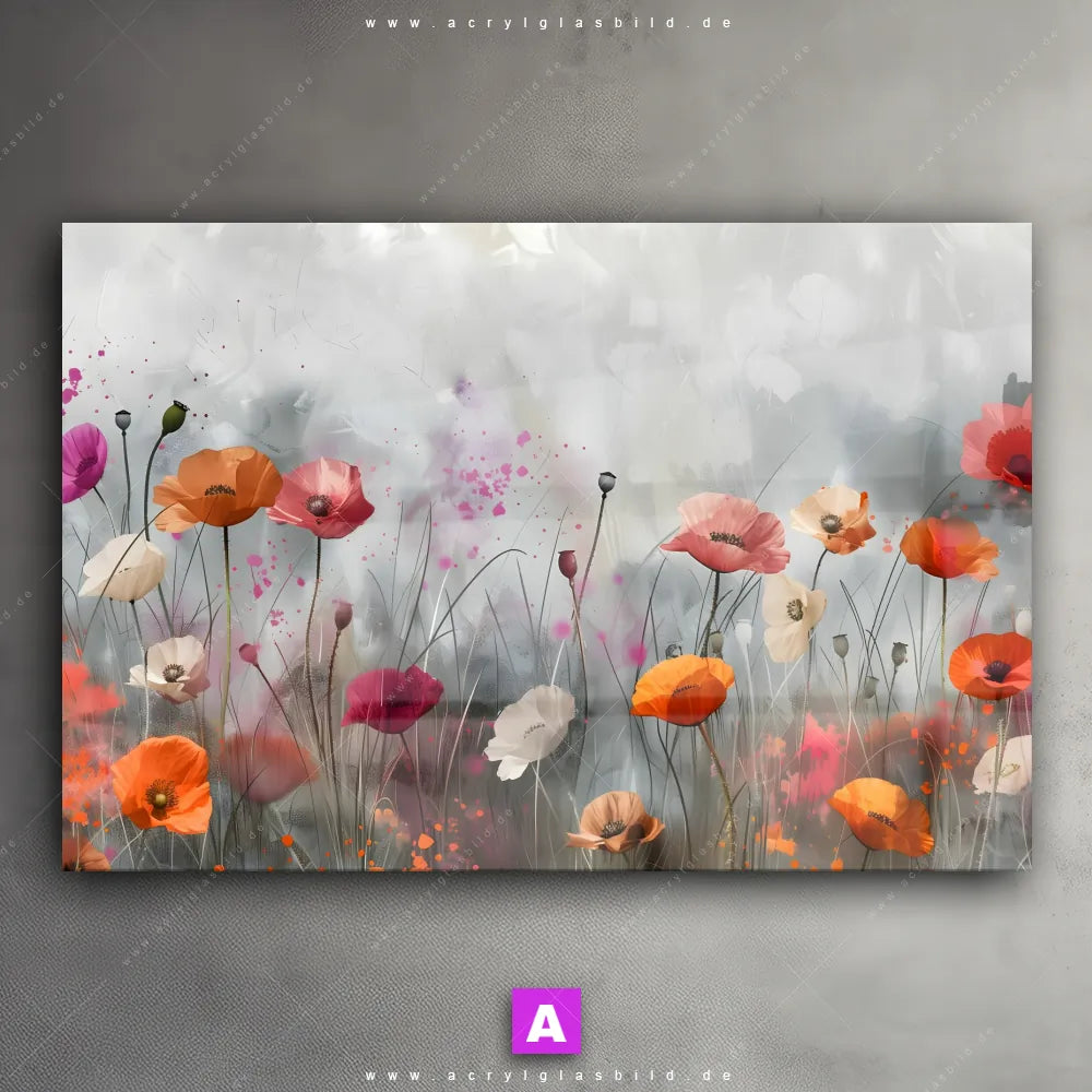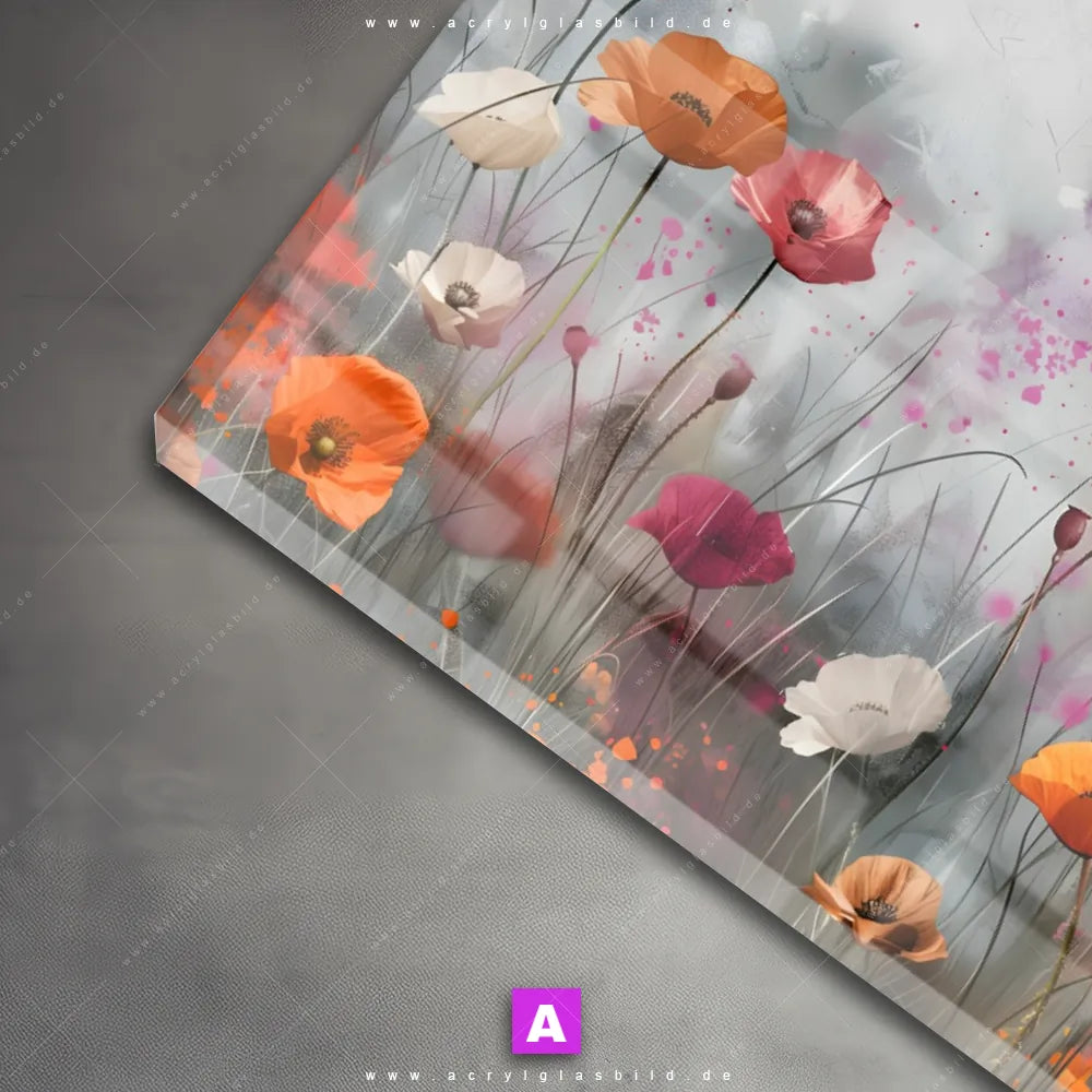 <b>Produktart:</b> Acrylglasbild | Glasbild | Wandbild aus Kunstglas | <b> Motiv:</b> Zarte Mohnblumen im Wind | <b> Bildausrichtung:</b> Querformat | <b> Max. Motiv-Größe:</b> 360cm breit | 240cm hoch | <b> Verfügbare Formate: </b> Quadrat, Querformat, Hochformat, Panorama, Schmal, Rund | <b> Kategorie:</b> Blumen - Botanik, Landschaften | <b> Farben:</b> Weiss, Grau , Orange, Rot | <b> Kunstformen:</b> Digitale Kunst, Kunst - Malerei | <b> Kunststile:</b> Floral, Retro - Vintage, Abstrakt