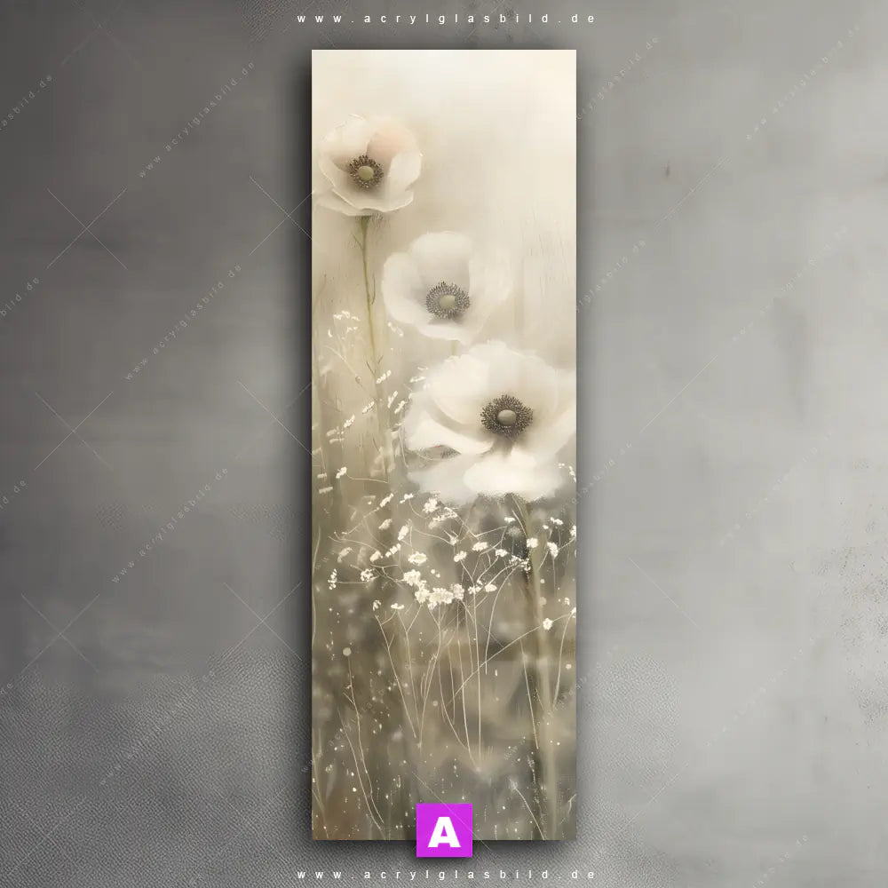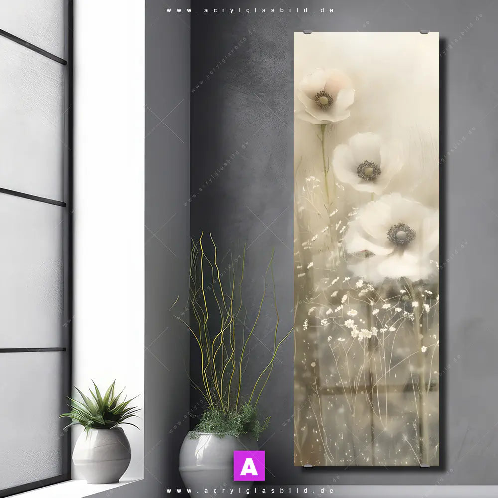 <b>Produktart:</b> Acrylglasbild | Glasbild | Wandbild aus Kunstglas | <b> Motiv:</b> Zarte Wildblumen in Pastelltönen | <b> Bildausrichtung:</b> Schmal | <b> Max. Motiv-Größe:</b> 240cm breit | 180cm hoch | <b> Verfügbare Formate: </b> Quadrat, Querformat, Hochformat, Panorama, Schmal, Rund | <b> Kategorie:</b> Blumen - Botanik, Landschaften | <b> Farben:</b> Weiss, Rot, Beige, Braun | <b> Kunstformen:</b> Digitale Kunst, Kunst - Malerei | <b> Kunststile:</b> Floral, Retro - Vintage, Abstrakt