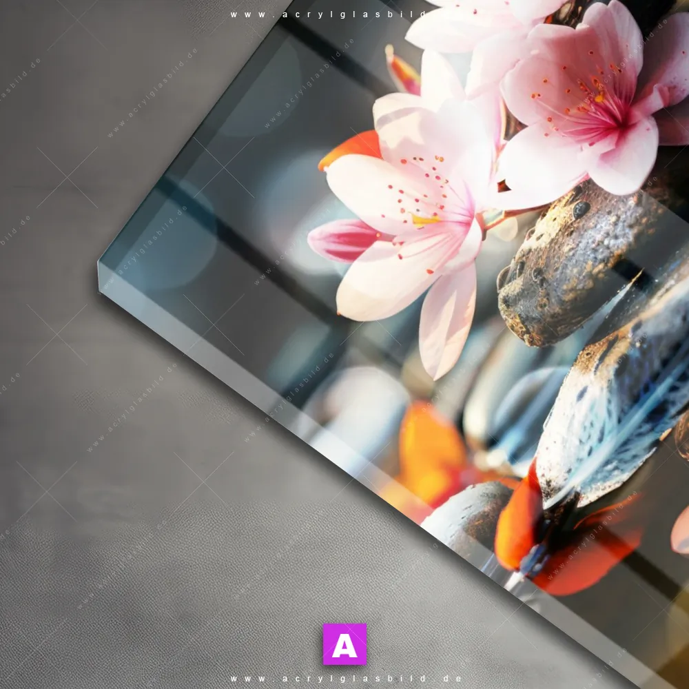 <b>Produktart:</b> Acrylglasbild | Glasbild | Wandbild aus Kunstglas | <b> Motiv:</b> Zen Steine mit Blumen | <b> Bildausrichtung:</b> Rund | <b> Max. Motiv-Größe:</b> 430cm breit | 240cm hoch | <b> Verfügbare Formate: </b> Quadrat, Querformat, Hochformat, Panorama, Schmal, Rund | <b> Kategorie:</b>  Blumen - Botanik, Buddha - Feng Shui | <b> Farben:</b>  Schwarz, Rosa, Orange | <b> Kunstformen:</b>  Digitale Kunst, KI-generiertes Bild | <b> Kunststile:</b>  Floral, Modern Art